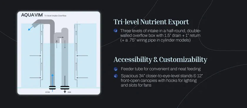 AQUA VIM® luxury glass aquariums come with built-in three-level intake overflow boxes (larger tank sizes have 2 overflows) and predrilled 1.5 drain and 1 return holes for plumbing. Tanks are top-braced with glass rims for maximum structural integrity. The drilled feeder hole in the brace of the tank allows for accessibility and convenient feeding. For ease of setup, dual openings in the back corners of the brace allow for customization and wiring of internal tank accessories such as air pumps, heaters, and wave makers. Aquariums come with a black vinyl background attached.