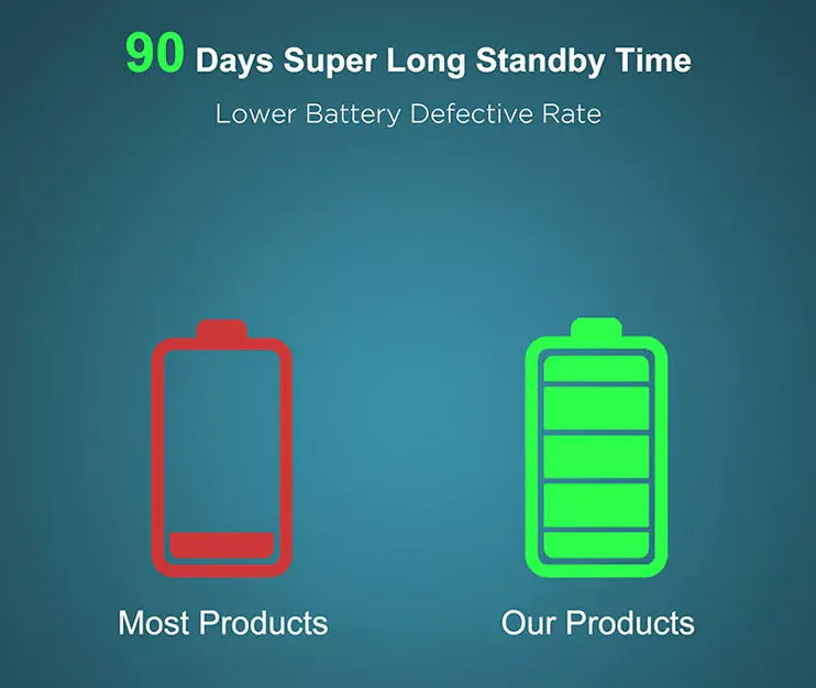 Most products have to continuously be recharged. Our product has a super long life battery and can stay charged up to 90 days standby.