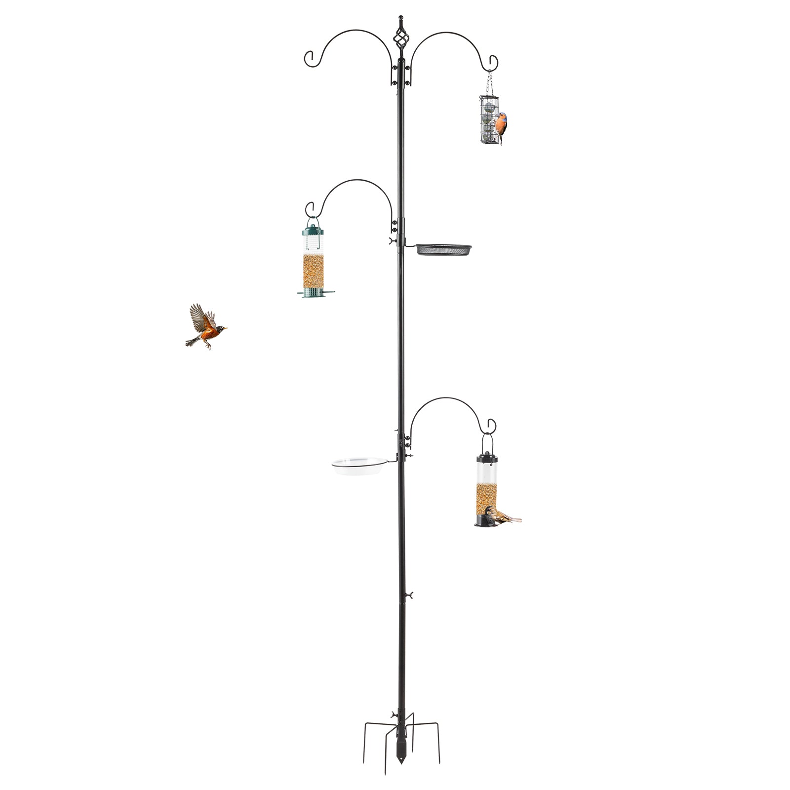 3. The top hooks are great for hopper, tube and nyjer feeders - effective in attracting smaller birds like finches, chickadees, titmice and junocs. The additional arms offers more hanging options. Suet basket attracts nuthatches, woodpeckers, parrots, wrens and starlings. The mesh tray can hold mealworms, peanuts, dried fruit or milo for ground feeding birds like cardinals, juncos, doves, robins and jays. The plastic water bowl functions as a birdbath.