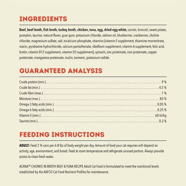 ACANA™ CHUNKS IN BROTH VEEF & TUNA RECIPE Adult Cat Food is formulated to meet the nutrition levels established by the AAFCO Cat Food Nutrient Profiles for maintenance.
