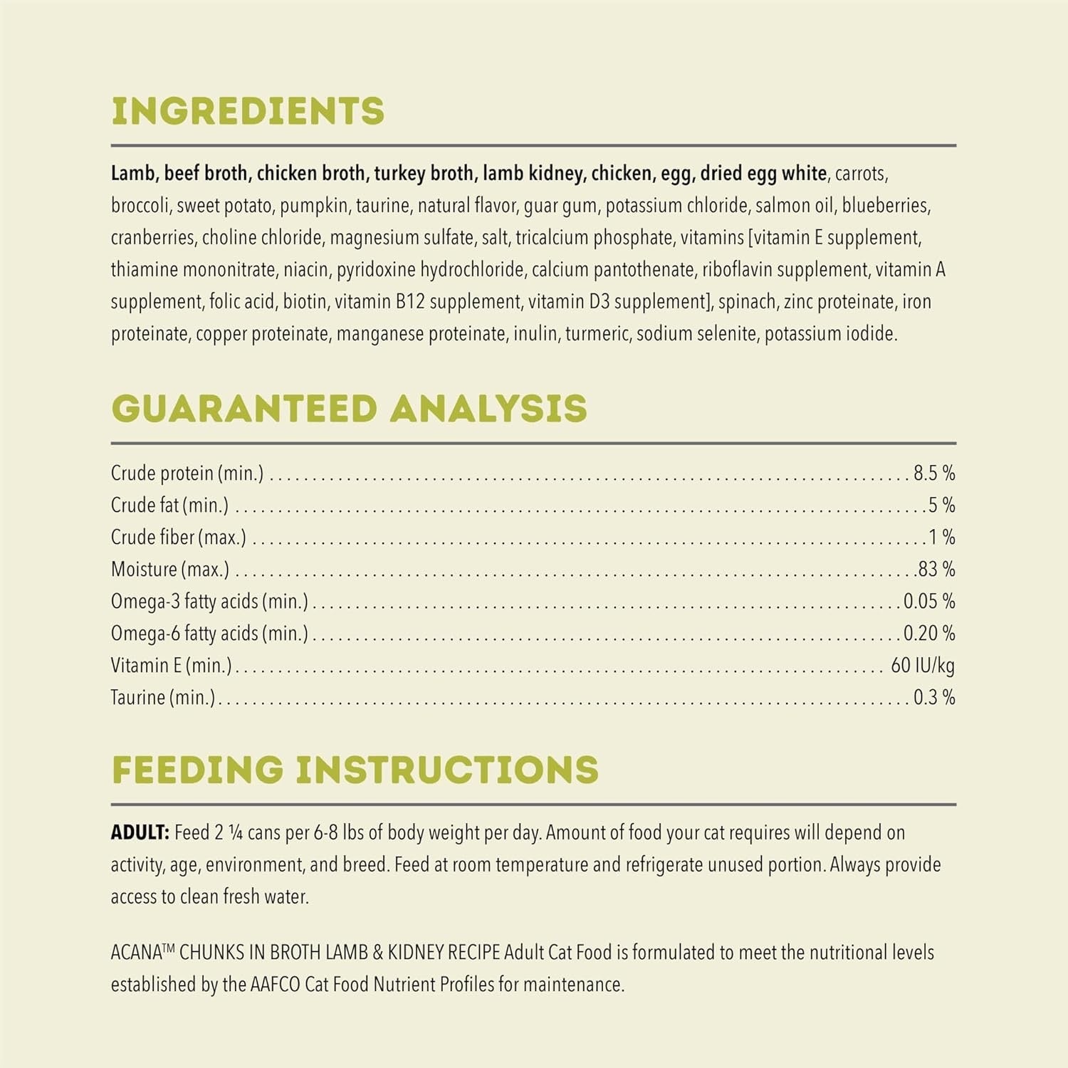 ACANA™ CHUNKS IN BROTH LAMB & KIDNEY RECIPE Adult Cat Food is formulated to meet the nutrition levels established by the AAFCO Cat Food Nutrient Profiles for maintenance.