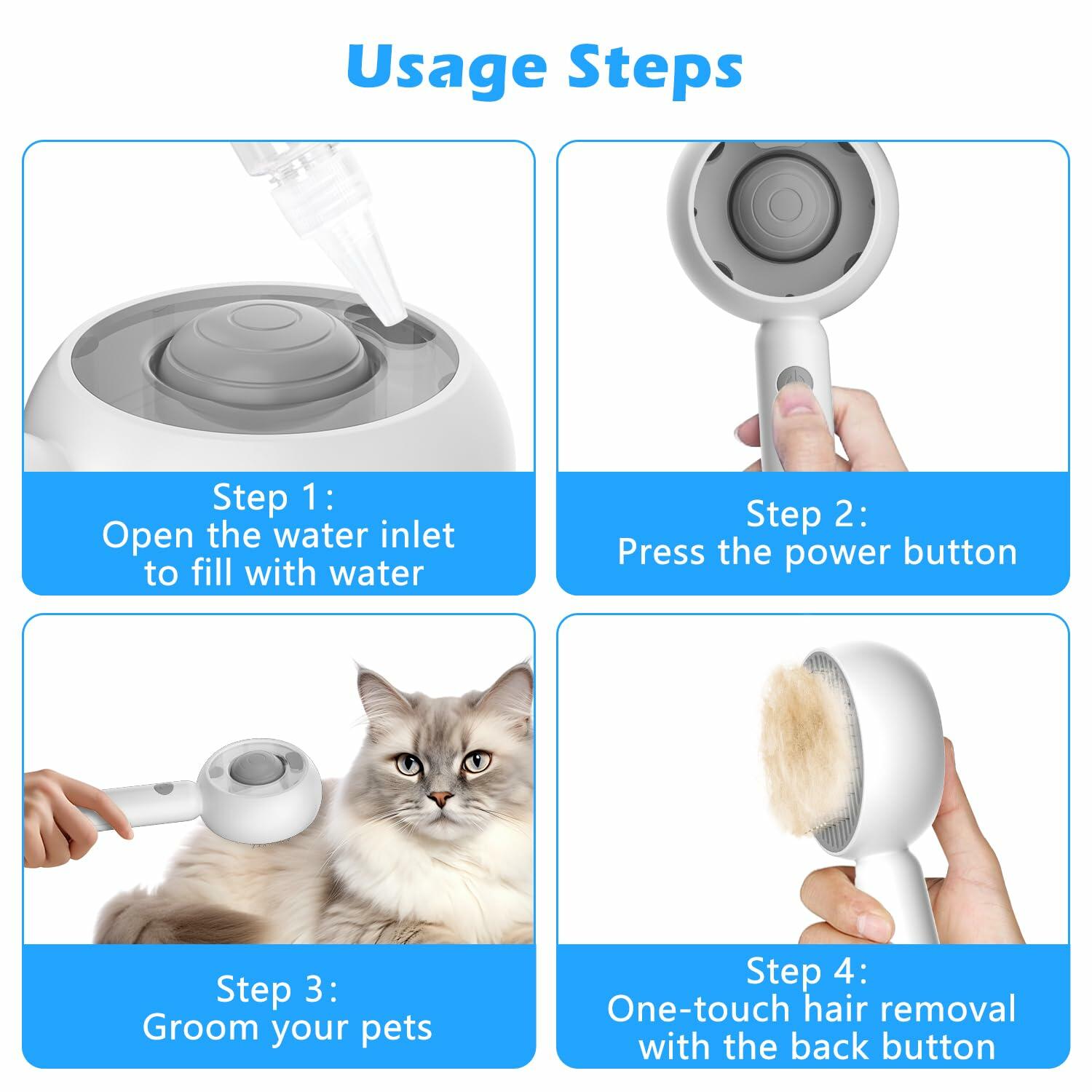 4-In-1 Cat Steam Brush: ALAFLY Cat Steam Brush innovatively combines steam moisturizing, anti-static, deep cleaning, and one-button cleaning. It can provide you and your pet with a comfortable combing process and is suitable for all pets with long and short hair.