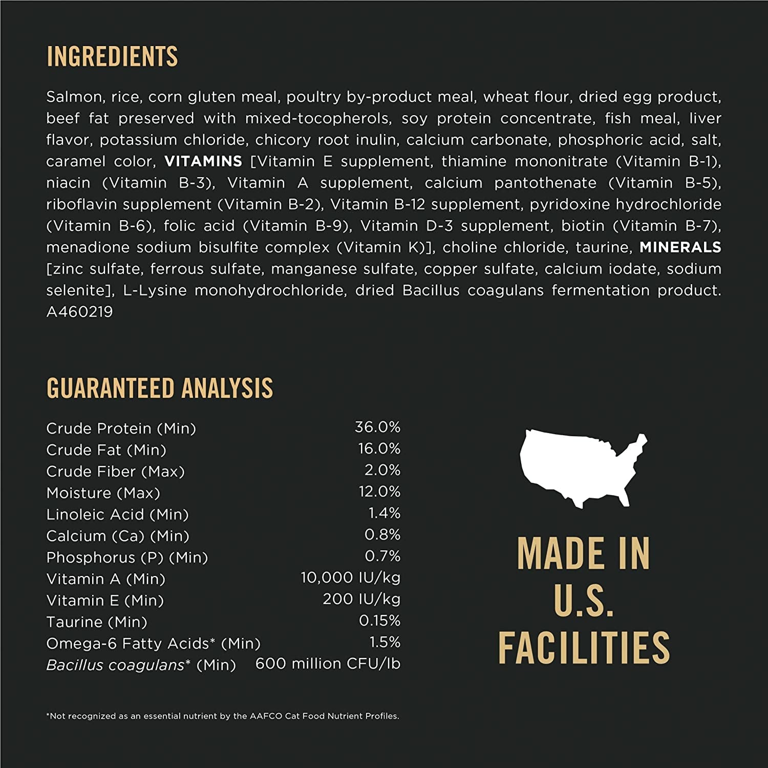- Salmon is the first ingredient in this high protein dry cat food for skin and coat care
