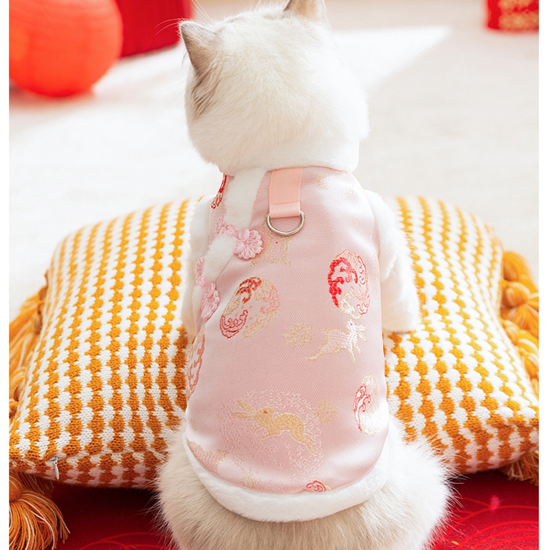 Celebrate the Year of the Rabbit in traditional style with this Lunar New Year Pet Vest! Available in vibrant red (with golden rabbit and prosperity patterns) and elegant pink (with delicate floral and rabbit embroidery), each vest features luxurious brocade fabric, plush faux fur trim, and an integrated leash ring. The intricate rabbit motifs and traditional knot details embody Lunar New Year’s prosperity and cultural heritage, making it perfect for festive gatherings. Ideal for pet parents wanting to share the holiday spirit, this collection combines craftsmanship, festive charm, and functional design, ensuring your furry companion stands out with Lunar New Year elegance.