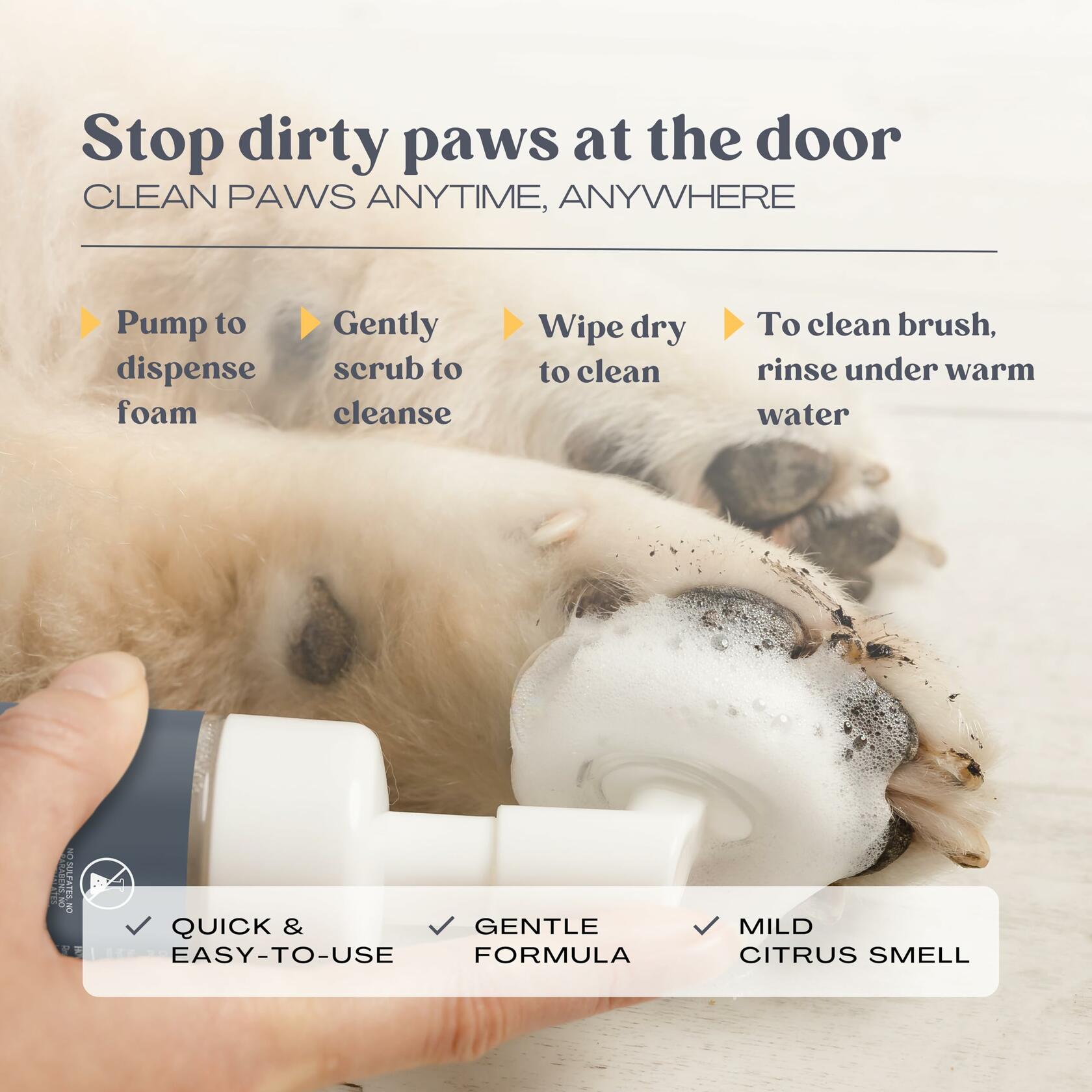 - CLEANS 2X FASTER WITHOUT WATER - Upgrade your dog's paw cleaning routine with our convenient pet paw cleaner. Effectively scrub away dirt and environmental toxins and clean paws for dogs and cats in half the time with our no rinse foaming paw cleanser combined with a built-in, removable soft silicone paw scrubber. Simply pump, scrub and wipe dry. Suitable paw cleaner for cats and dogs of all sizes and breeds.