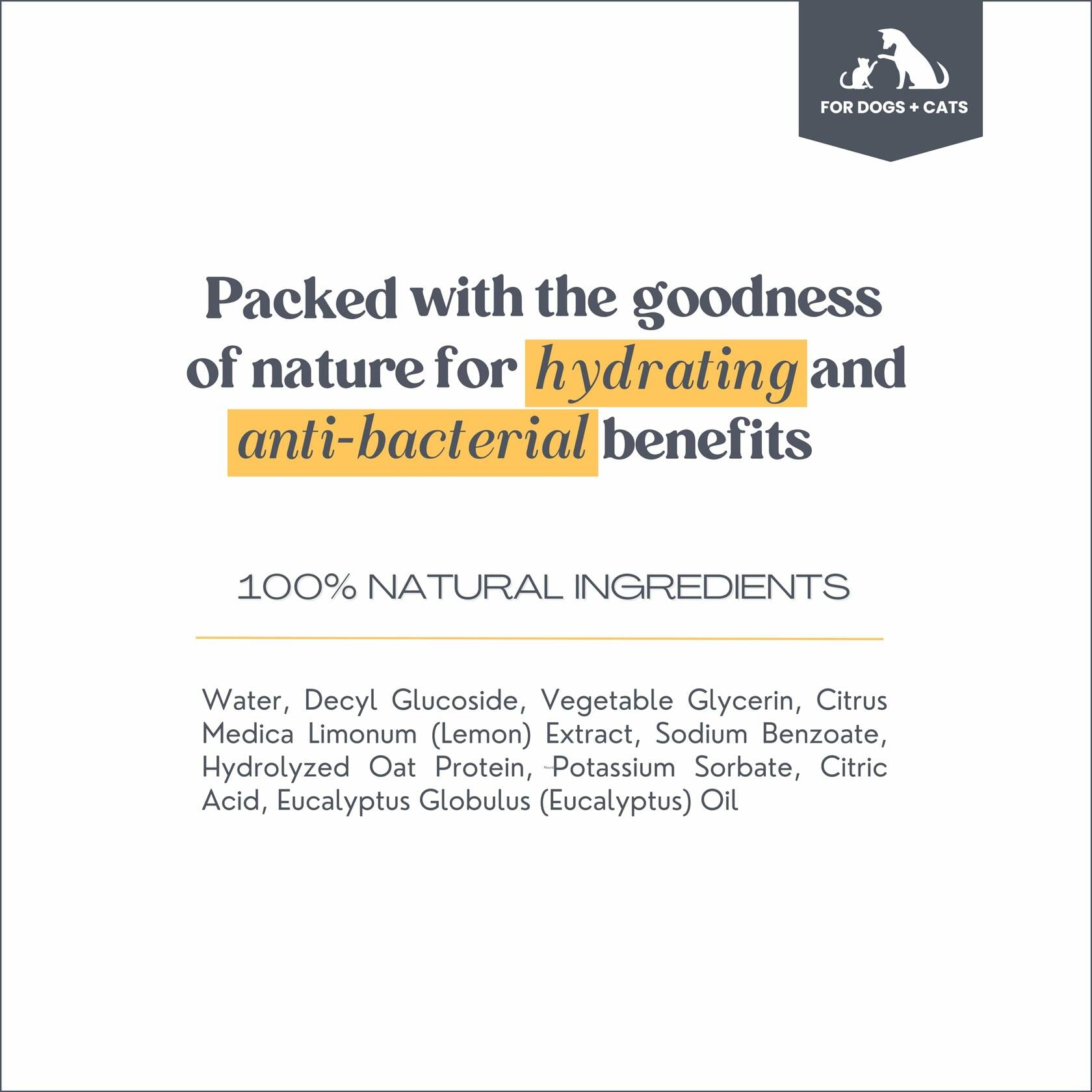 PLANT-BASED, NON-TOXIC, LICK SAFE, FUR-LOVING INGREDIENTS: Water, Decyl Glucoside, Vegetable Glycerin, Citrus Medica Limonum (Lemon) Extract, Sodium Benzoate, Hydrolyzed Oat Protein, Potassium Sorbate, Citric Acid, Eucalyptus Globulus (Eucalyptus) Oil