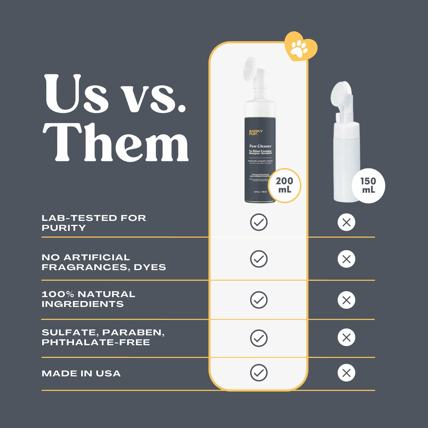 - NON-TOXIC & LICK SAFE - Say goodbye to harsh chemicals and hello to peace of mind with our non-toxic dog foot cleaner. Made with plant-based ingredients, our dog paws cleaner is safe for your furry friend and you can trust that it is free from harmful chemicals such as sulfates, phthalates, parabens, dyes and artificial fragrances.