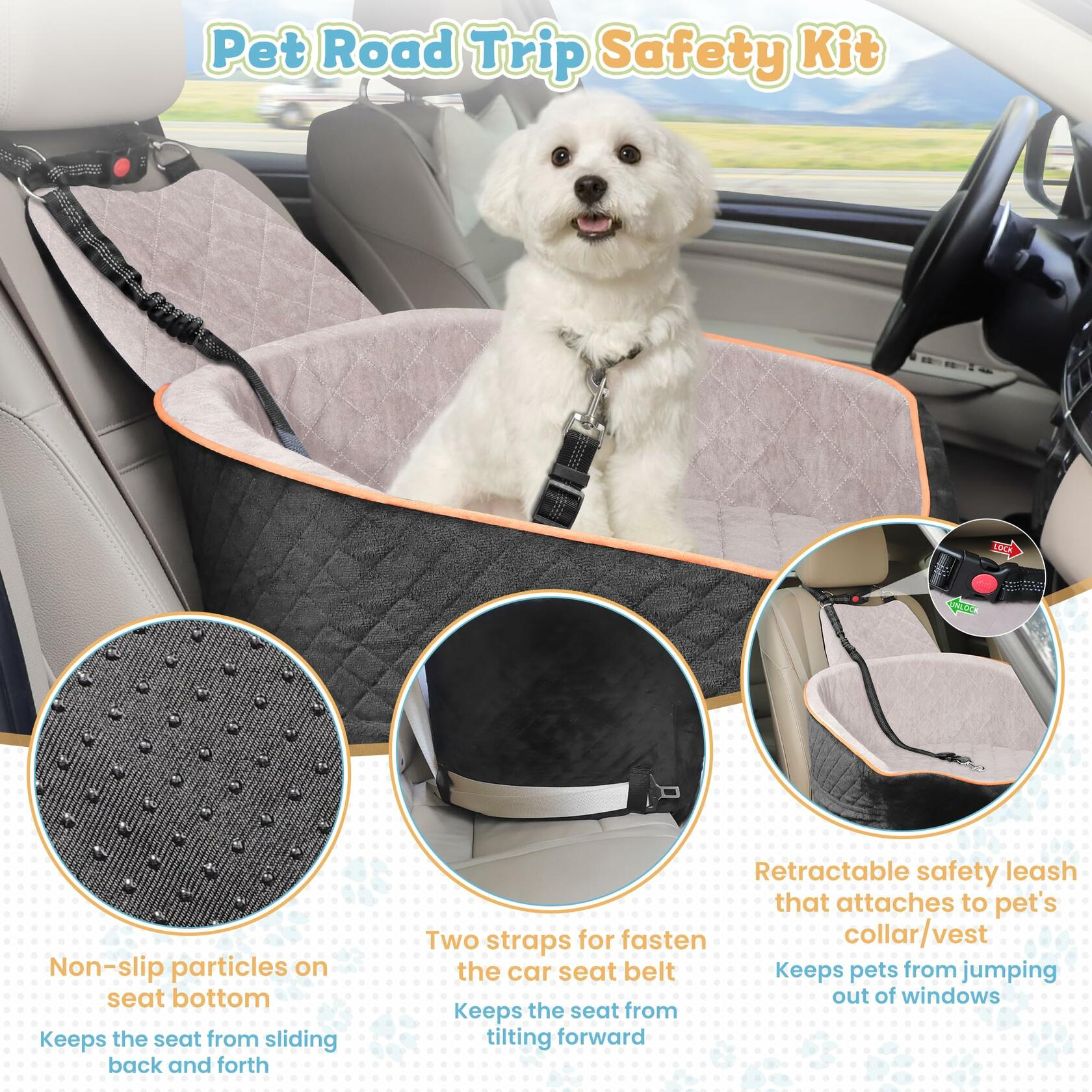 - Pet Road Trip Safety Kit: The bottom of the seat has anti-slip particles, and two straps on both sides of the bottom of the rear of the seat are used to fasten the car seat belt, dual enhancement of seat stability. There's an extra a retractable safety rope to the pet's collar/vest to prevent your dog from jumping out the window.