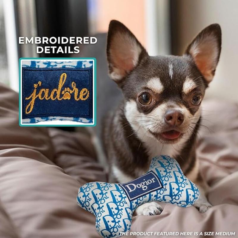 Introducing Dog-ior Bones, the epitome of luxury for your stylish pup. Each bone features a built-in squeaker to provide endless entertainment.