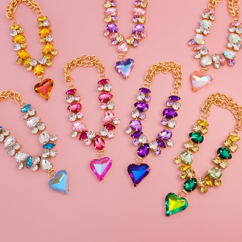 Technical Specs • Materials: zinc-alloy (gold-tone plating), glass/resin crystals • Colors: pink, purple, mixed (subject to the actual product batch) • Size: adjustable chain with extender; heart charm approx. 0.8–1.2 in (2–3 cm); chain width approx. 0.4–0.47 in (1–1.2 cm) • Use: decorative only; not for leash attachment or pulling • Weight: lightweight, approx. ≤1.8 oz (≤50 g)