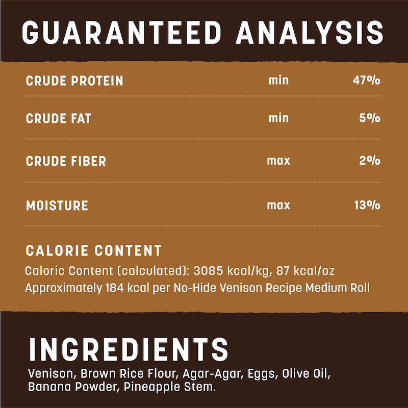 Free-Range, Grass Fed Venison, Brown Rice Flour, Agar-Agar (a plant-based gelatin), Olive Oil, Eggs, Banana Powder, Pineapple Stem.