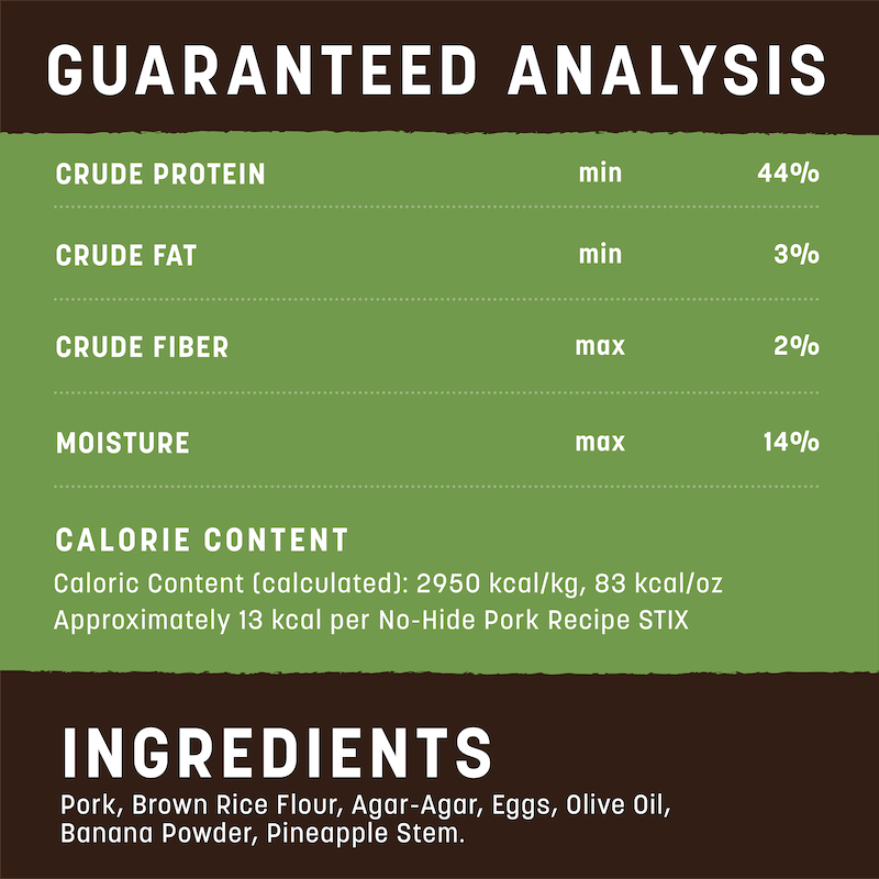 Humanely Raised Pork, Brown Rice Flour, Agar-Agar (a plant-based gelatin), Olive Oil, Eggs, Banana Powder, Pineapple Stem.