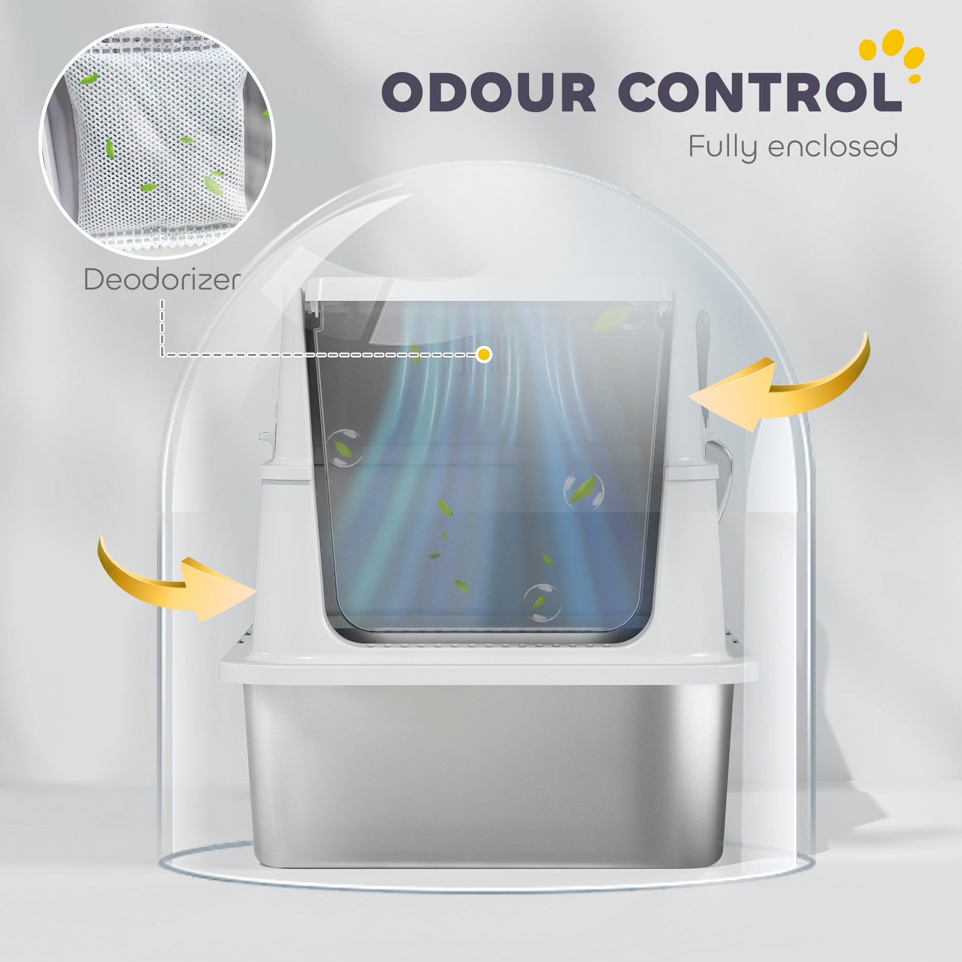- - Fully Enclosed and Deodorized: The litter box locks in odors with its sealed construction and provides a designated spot for deodorizer packs, ensuring your living space remains fresh and welcoming