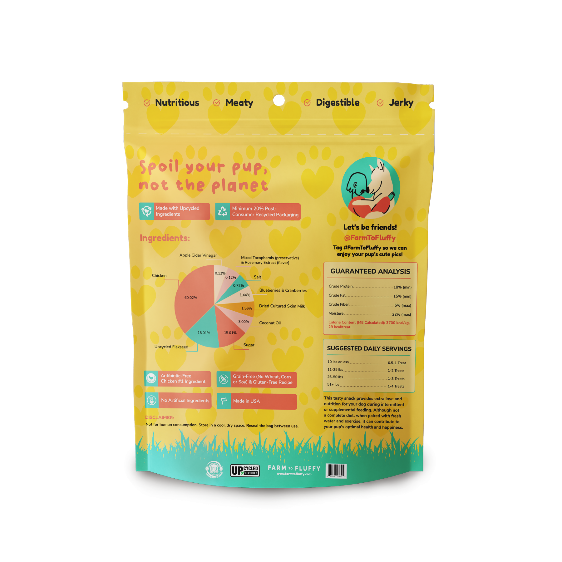 -Real Meat First: Chicken from the USA is the #1 Ingredient -Protein-Packed Chicken Jerky Dog Treats -Air-Dried -Grain-Free & Gluten-Free Recipe -Great for dogs of All Ages, Breeds and Sizes -Breakable Chunky Training Treats -Made in USA -Made with Upcycled Ingredients Benefits: -They are low in cholesterol, fat, and calories while being flavorful. -Chicken contains amino acids, chondroitin sulfate, and glucosamine, which promote healthy bones and joints. -They will improve the health of your pet’s gums and teeth by gently removing plaque. All Farm to Fluffy Dog Treats are free of artificial colors, flavors, fillers, or preservatives. We inspect each batch to ensure we produce the safest and highest quality dog treats for your pet!