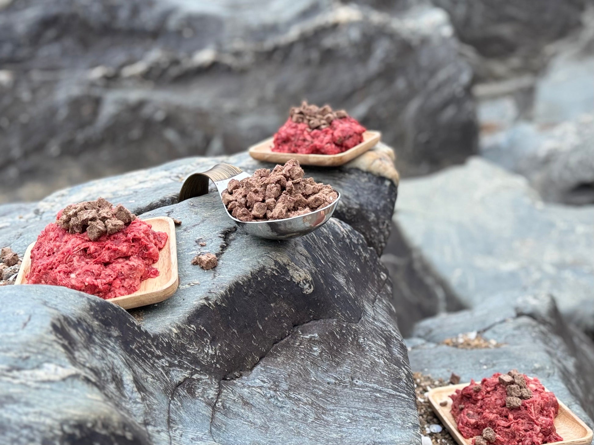 Muscle Blend: 70% raw beef muscle, 10% unwashed fatty tripe, 10% ground bone, 5% liver, 5% heart/spleen/kidney.