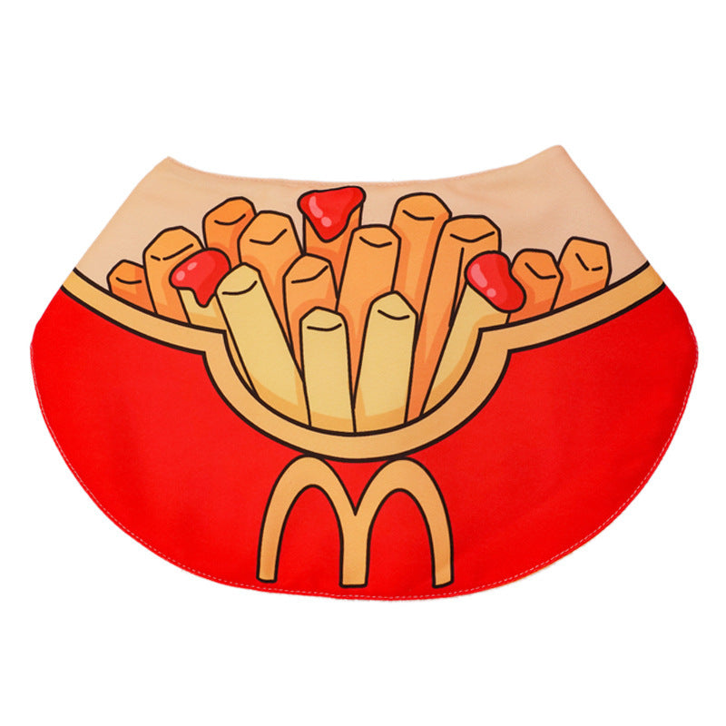 • Unique Cartoon Designs – Choose from fries, watermelon, popcorn, or a fun cartoon style to match your pet’s personality. • Lightweight & Comfortable – Made with soft fabric that won’t irritate your dog’s skin. • Easy to Wear – Quick buckle straps make it simple to put on and take off. • Keeps Fur Clean – Helps reduce mess during eating, drinking, or playtime. • Photo-Ready Accessory – Cute and funny look, perfect for daily walks, parties, or social media photos.