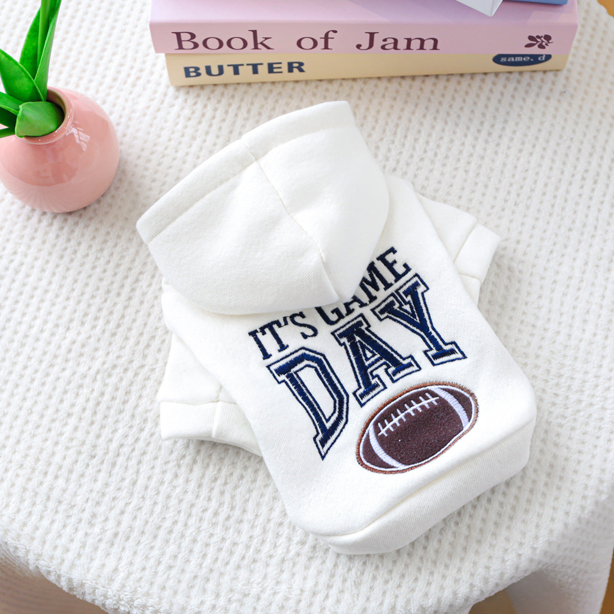 It’s game time! Whether you're tailgating or chilling on the couch, this adorable dog hoodie is the perfect way for your pup to show off their sporty side. With varsity-style lettering and a football patch, it's made for furry fans of fun and comfort.