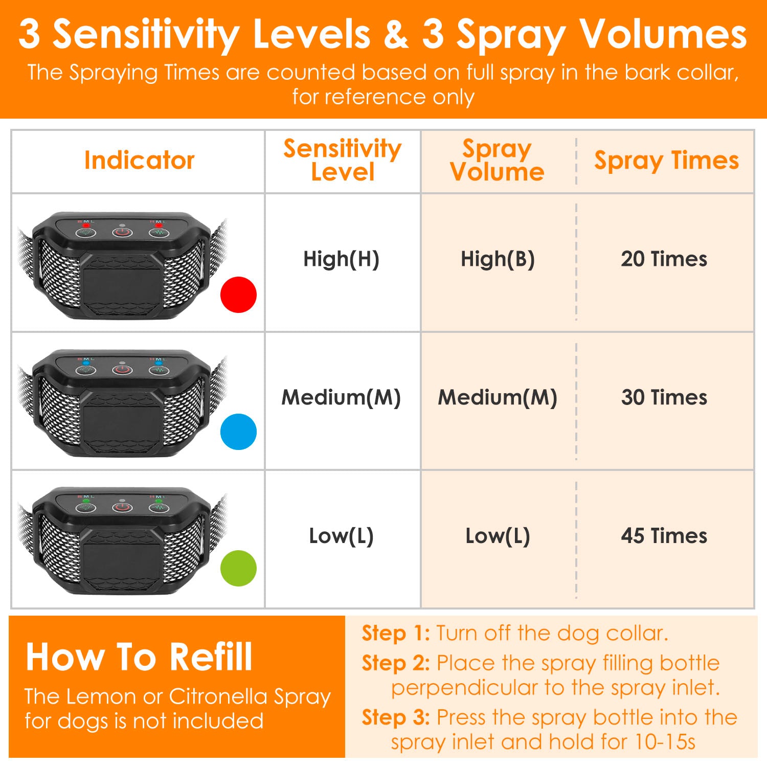 Do you feel distressed by your dog's barking? Concerned that static shocks may harm your dog's neck? Our citronella bark collar provides a safe solution. It automatically releases a harmless citronella spray when it detects barking, effectively stopping unwanted behavior without causing pain. Perfect for protecting puppies, this collar is shock-free and ensures your dog's well-being. With three adjustable sensitivity levels and spray volumes, you can tailor it to suit your dog's needs. Enjoy up to 24 days of standby time after just 1.5 hours of fast charging. IP65 waterproof, it’s suitable for small, medium, and large dogs.