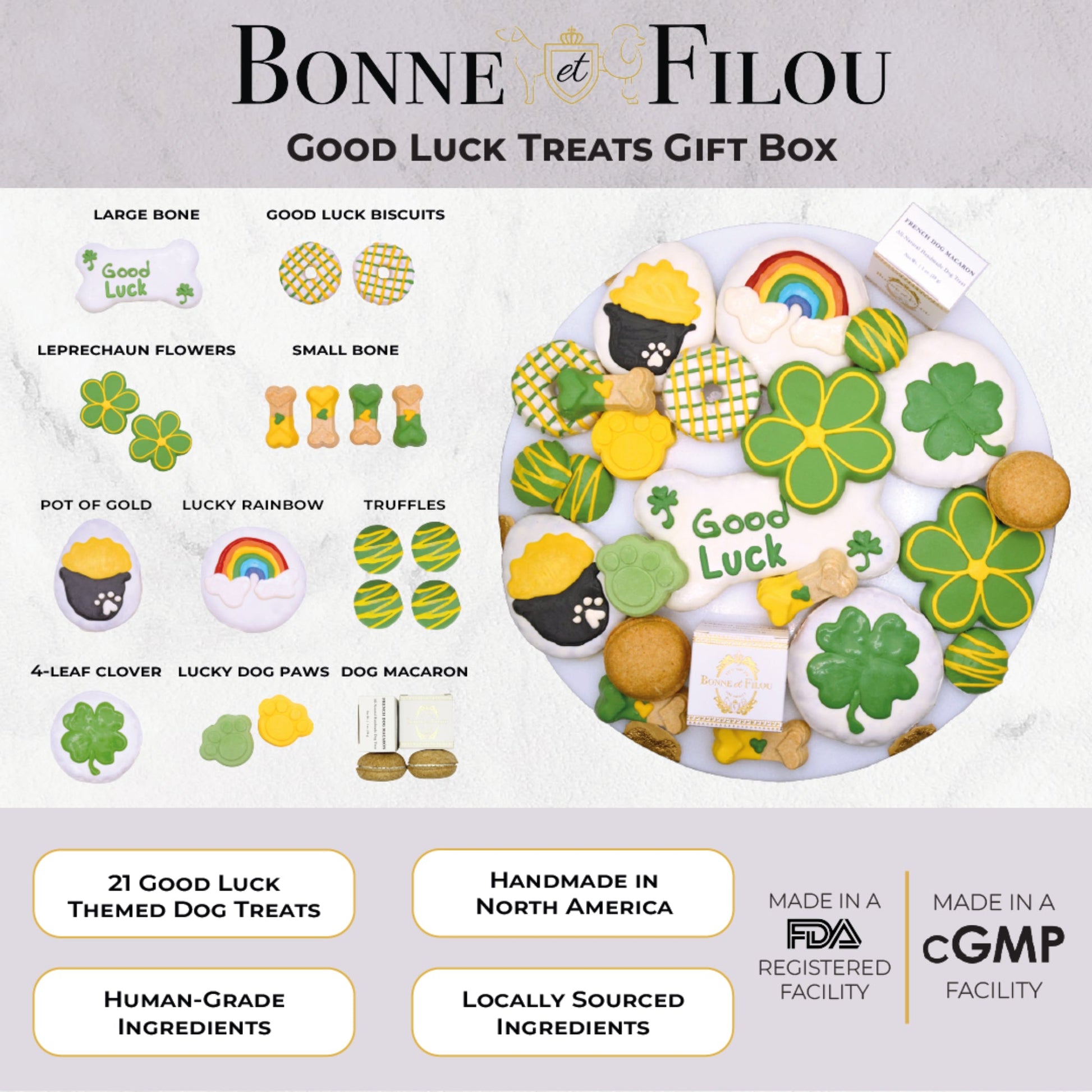 - Includes 21 themed treats including lucky rainbows, 4-leaf clovers, good luck biscuits, dog bones, macarons, and truffles, etc.