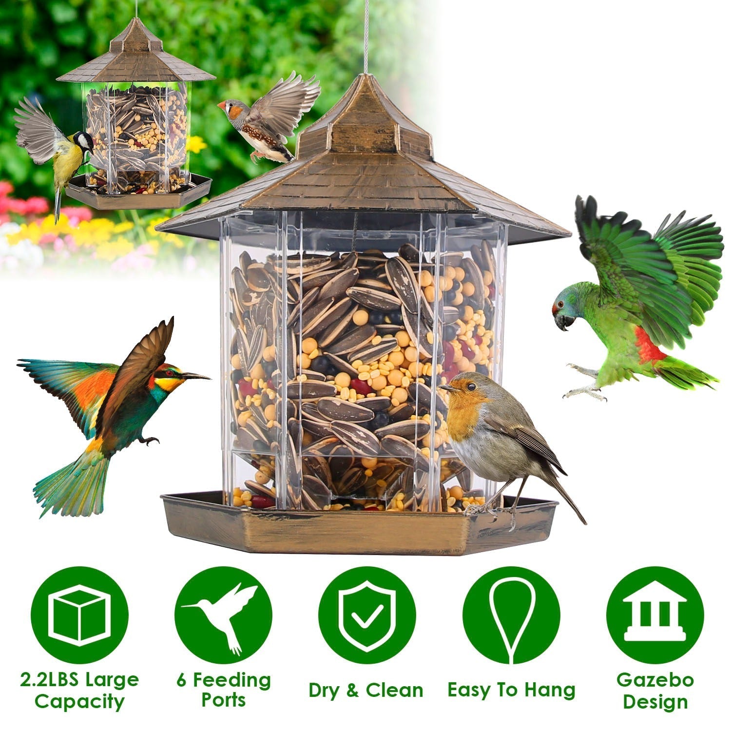 Hanging Gazebo Wild Bird Feeder Outdoor Bird Seed Station with Large Capacity 6 Feeder Ports for Garden Patio Park Weatherproof Easy To Refill