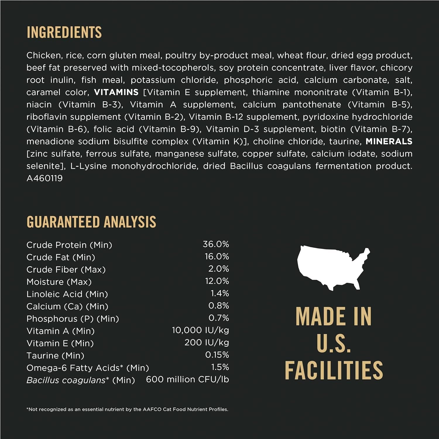 Discover the difference feeding your cat Purina Pro Plan LIVECLEAR Chicken and Rice Formula adult dry cat food can make in both of your lives. The first formula of its kind, this allergen-reducing, digestive cat food simply and safely neutralizes Fel D 1, the major allergen in cat saliva, through the use of a key protein sourced from eggs. Discovered through over a decade of research, LIVECLEAR was shown to reduce the major allergen in cat hair and dander by an average of 47 percent starting in the third week of daily feeding. With chicken as the first ingredient, this high protein cat food kibble helps provide the protein your cat needs for strong muscles. Plus, we fortify this gastrointestinal cat food with guaranteed live probiotics for felines to support digestive and immune system health. Try this groundbreaking Purina Pro Plan LIVECLEAR cat food risk free, and feed your favorite feline allergen-reducing nutrition that's part of the Purina Pro Plan line of SPECIALIZED formulas.