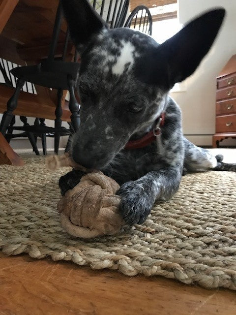 Introducing the Huggle-Hide® Natural Leather Ball Dog Toy—a premium, all-natural chew toy designed to satisfy your dog's instinctual chewing needs while promoting dental health. Crafted from tanned water buffalo hide with a tanned cowhide core and stuffed with cotton rope, this innovative, knotted, ball-shaped toy offers a durable and engaging chewing experience for your pup.