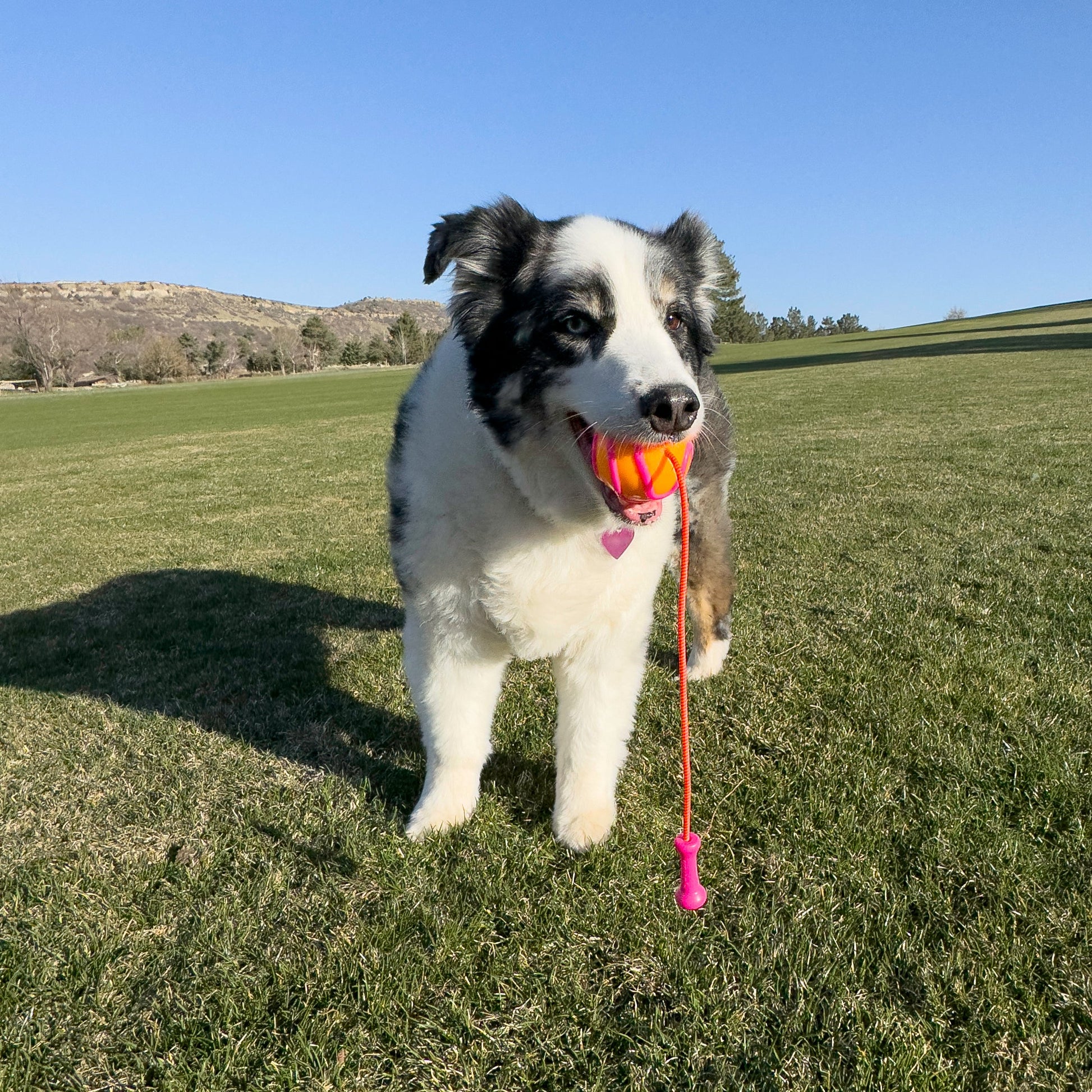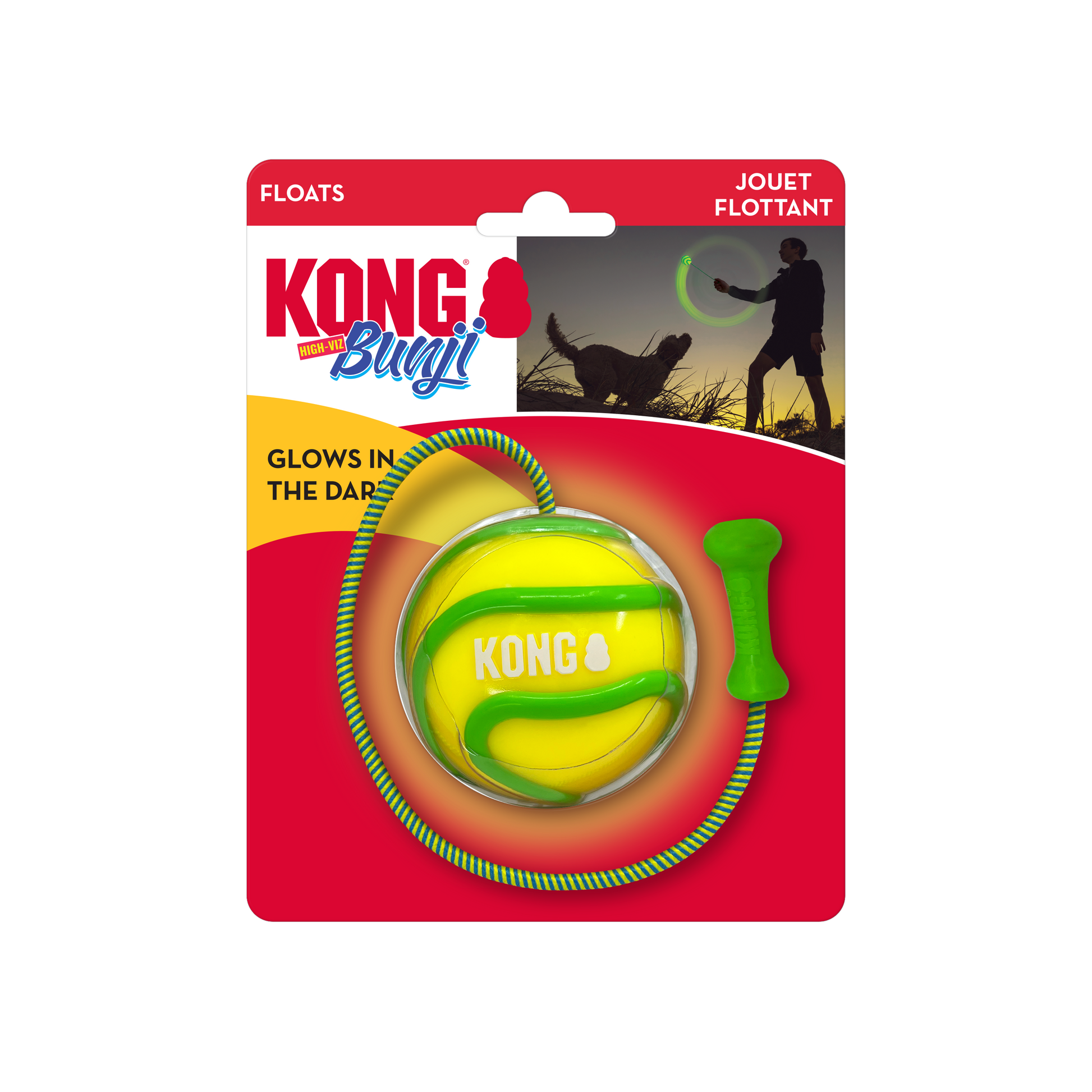 The KONG Bunji High-Viz Ball is specially designed with bright, high visibility colors for various environments, weather, and terrain. Ideal for fetch-and-retrieve play, this durable ball has raised ridges that create an unpredictable bounce, and an ergonomic bungee cord rope that effortlessly launches long distance, saving your shoulder from burnout! Glow-in-the-dark ball and handle make this toy perfect for playing after the sun goes down and on gloomy days—and it even floats in water! Charge the ball & handle under a lamp or in the sun for 15-20 minutes to activate glow-in-the-dark feature.