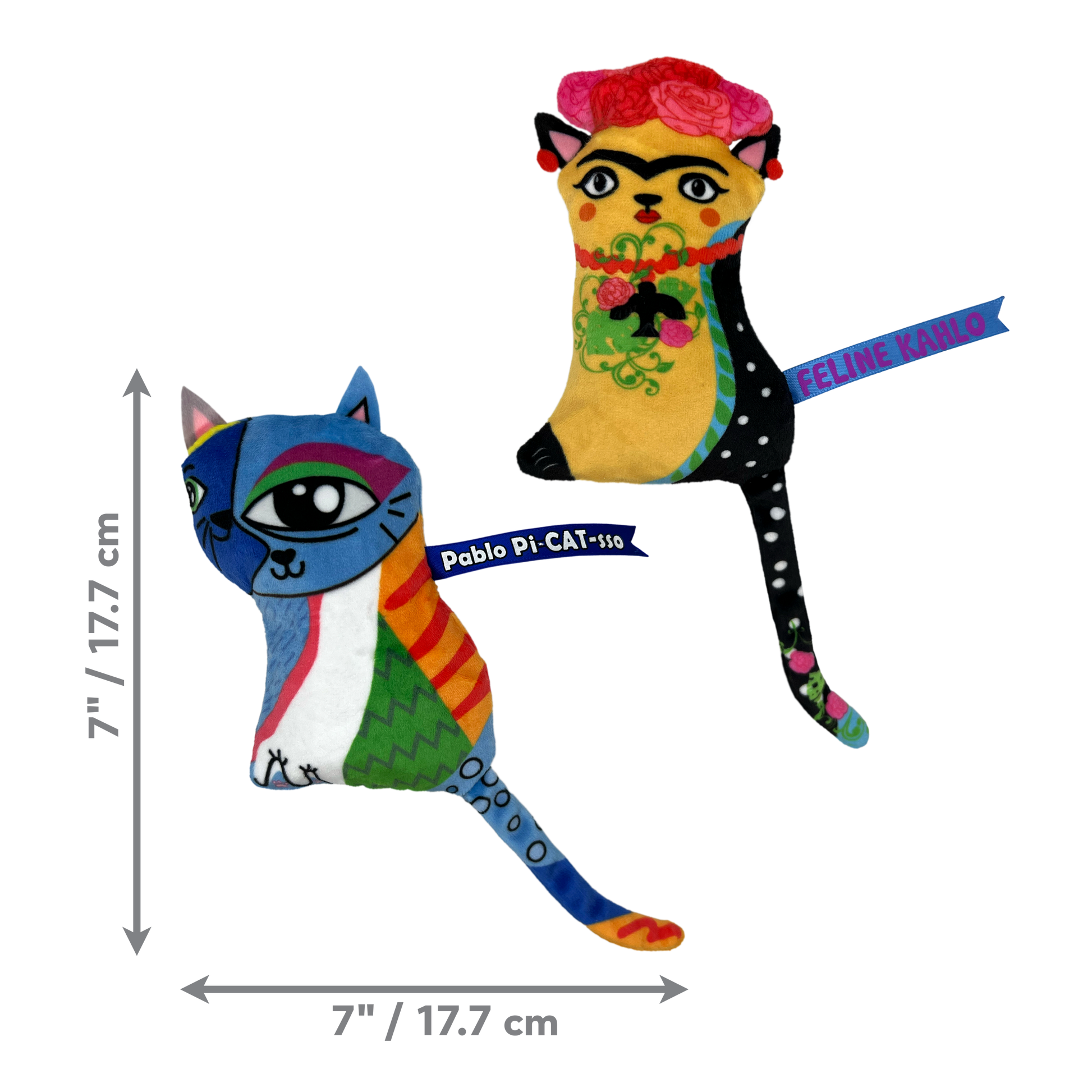 KONG Artz Cats are miniature masterpieces inspired by cats and world-famous artists. Now your cat can have an artist duo of their own—to cuddle with Feline Kahlo and pounce on Pablo Pi-CAT-sso. These crackling little works of art, filled with KONG Premium North American Catnip, each with a tail and ribbon for enticing chasing and swatting, will keep your cat batting, pouncing, and snuggling.