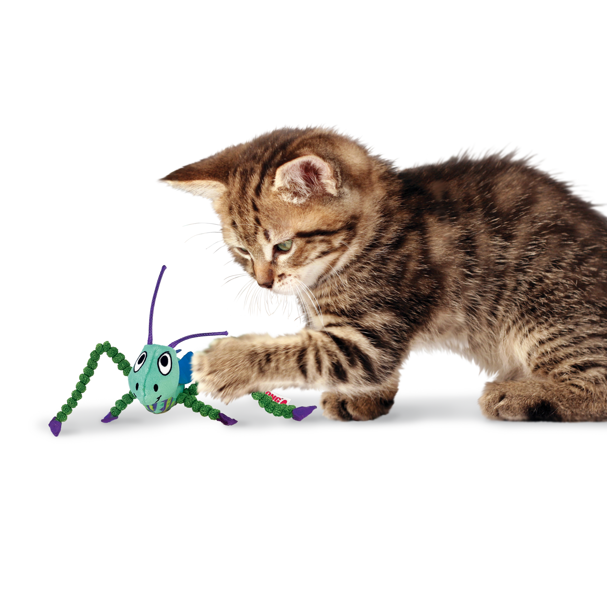 KONG Crackles Grasshopper’s springy legs and lightweight body make him ideal for batting and pouncing for tons of instinct-satisfying fun. A bell inside this grinning hopper’s head and crinkly wings keep cats playing while KONG North American Premium Catnip inside promotes play. Irresistible antennae and shiny wings invite batting.