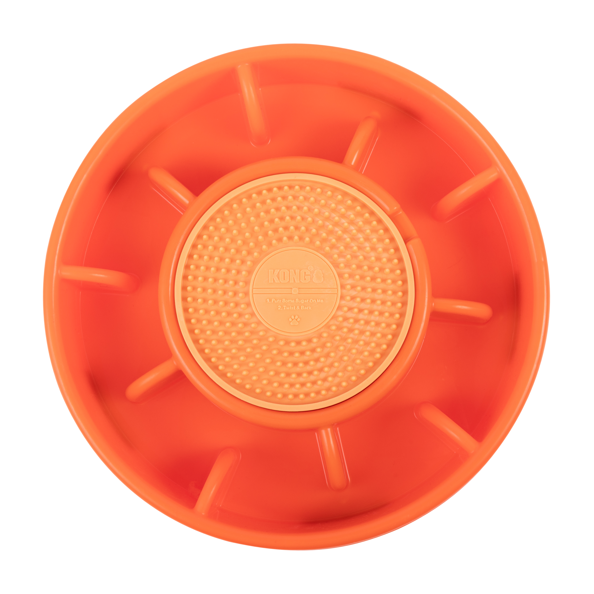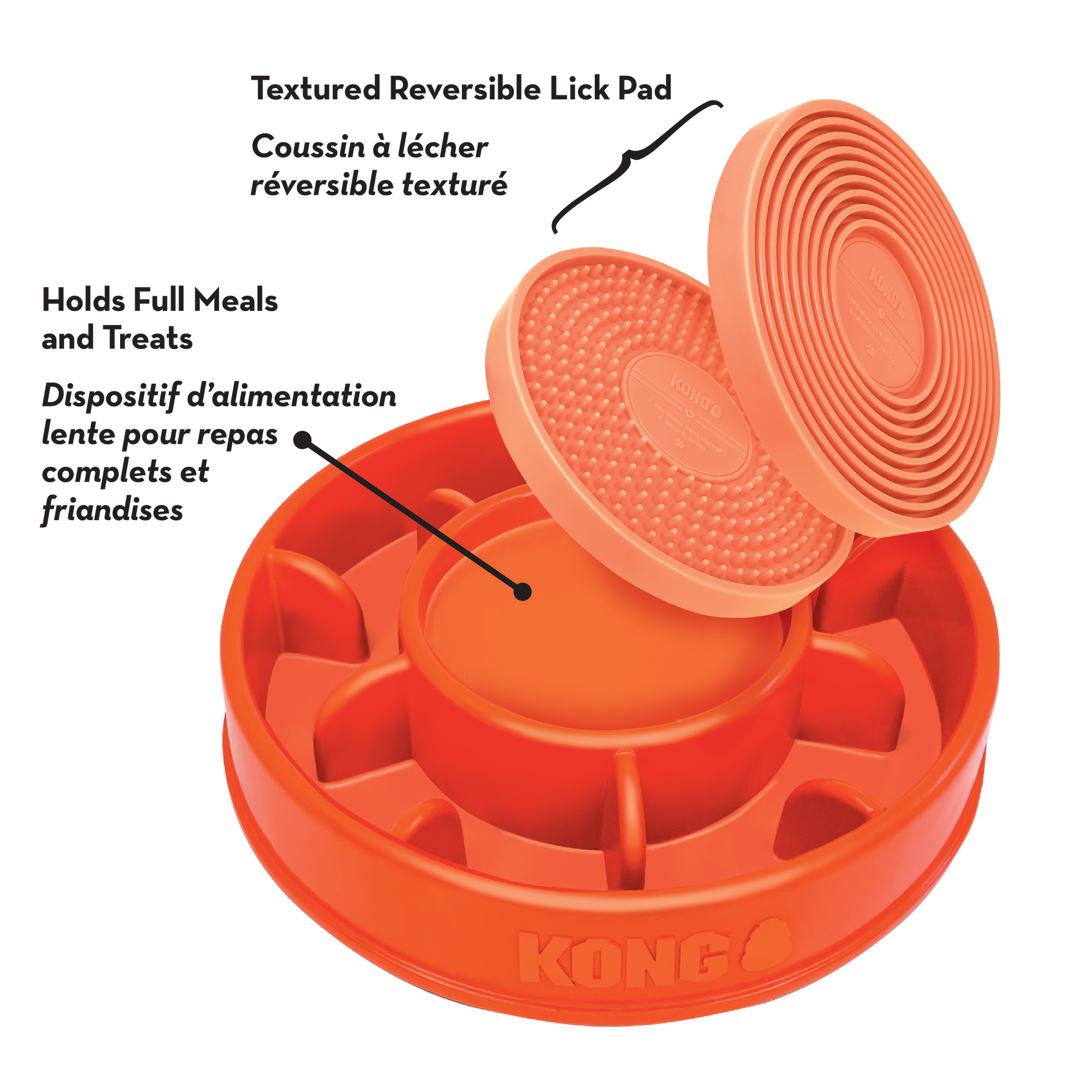 KONG Licks Mealtime is a dual-enrichment interactive feeder for dogs who need a challenge. Part slow-feeder, part lick pad, this toy can be used to slow down fast eaters for better digestion, weight loss, mental enrichment, and to support good oral health. The reversible lick pad offers nubs and ridges to hold treats and pastes, encouraging slow nibbling and licking to promote soothing, quiet moments. Licks Mealtime is ideal for rainy days, solo entertainment, mental stimulation, and everyday feeding or treating. Holds up to 4 cups of dry food. The lick pad is removable for easy cleaning. The bowl and lick pad should be hand washed and towel dried only.