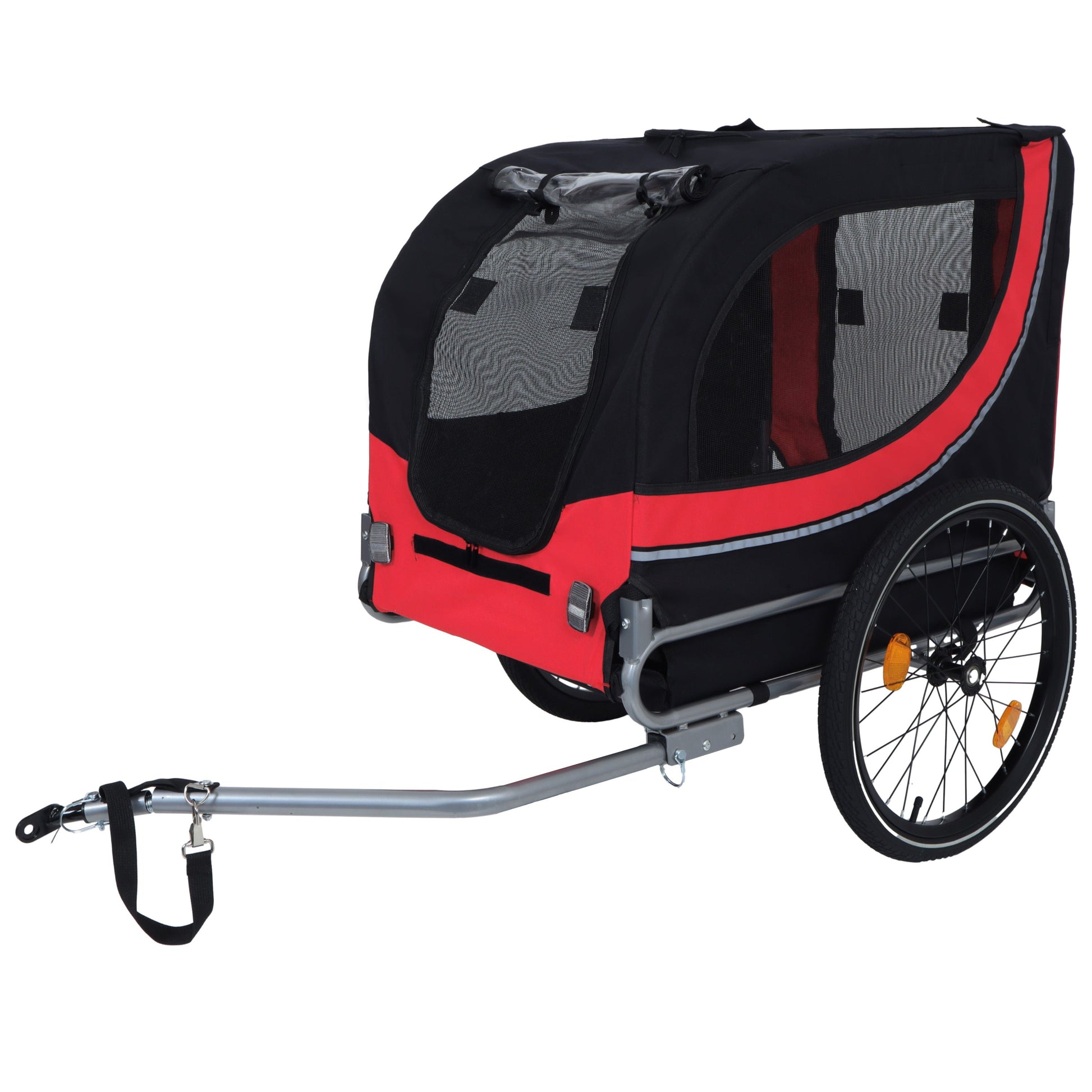 - All-Terrain Performance & Safety FeaturesGlide - smoothly over bumps with 20? air-filled tires designed for stability and shock absorption. A waterproof PVC rain cover shields against rain, while reflective wheel strips boost visibility in low-light conditions. The roll-up front panel offers pets a clear view, turning every ride into a scenic adventure.