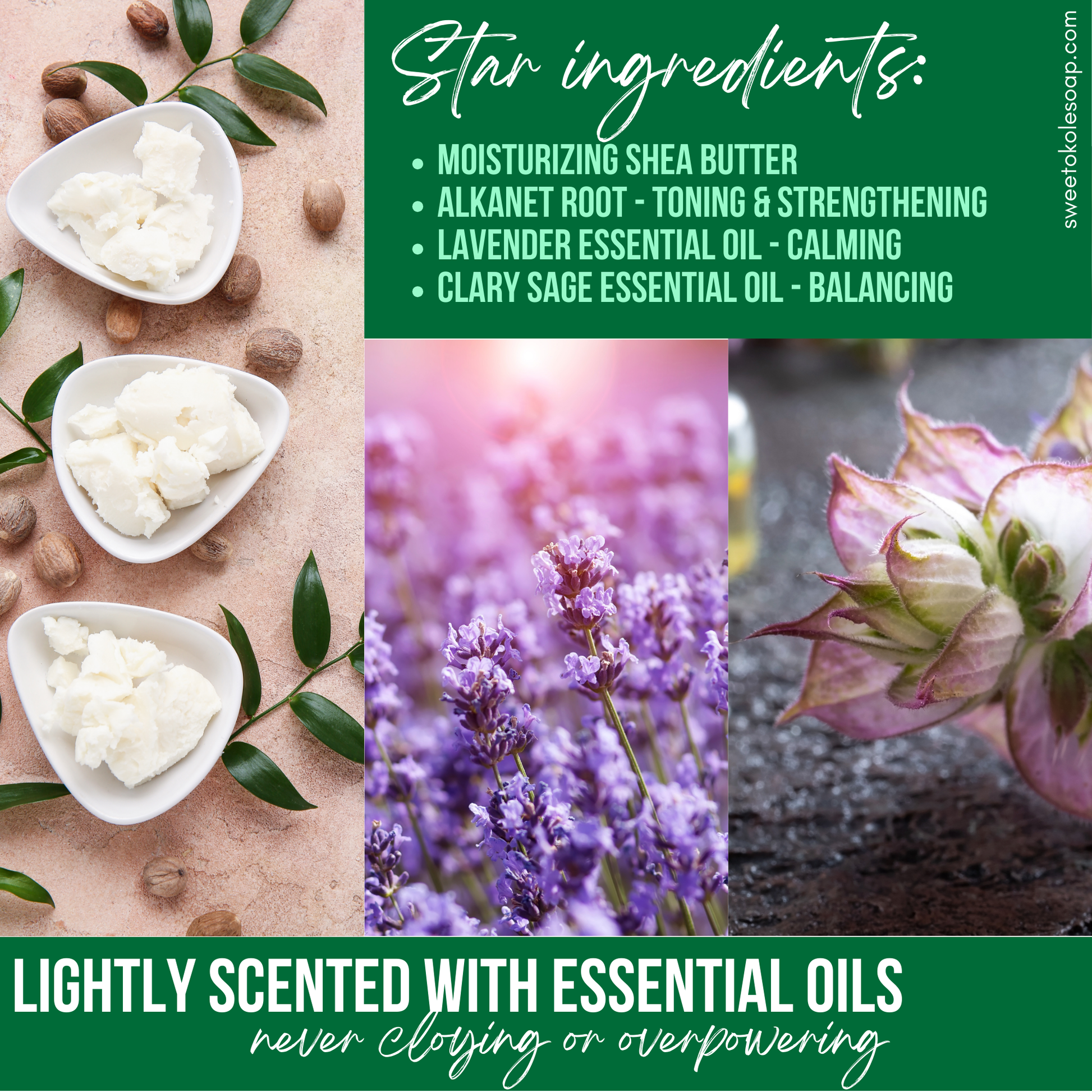 Scented with lavender, clary sage, and rosemary essential oils. Topped with anti-inflammatory ratanjot root (a beautiful ayurvedic herb).