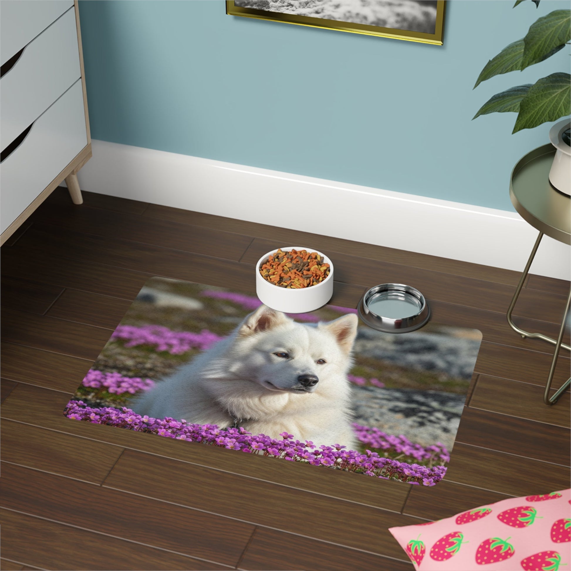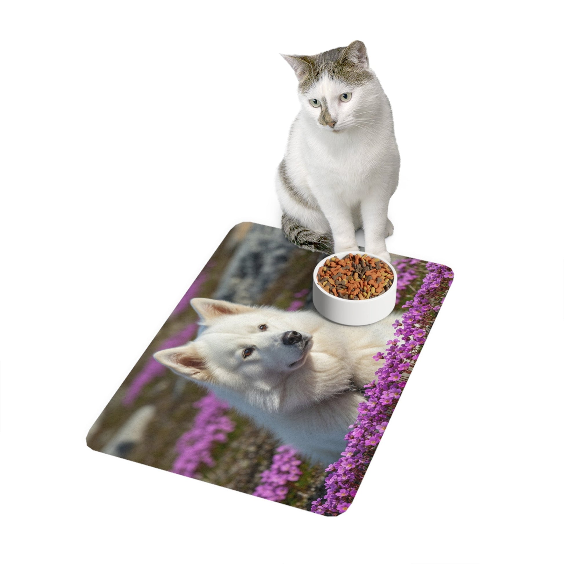 This Pet Food Mat 12x18 featuring a beautiful Canadian Eskimo Dog design is perfect for pet owners looking to add a touch of style to their pet's feeding area. The strong polyester front and neoprene rubber backing ensure durability and slip resistance. Vibrant colors make this mat stand out and add personality to your space. Perfect for pet owners celebrating their love for their furry friends.