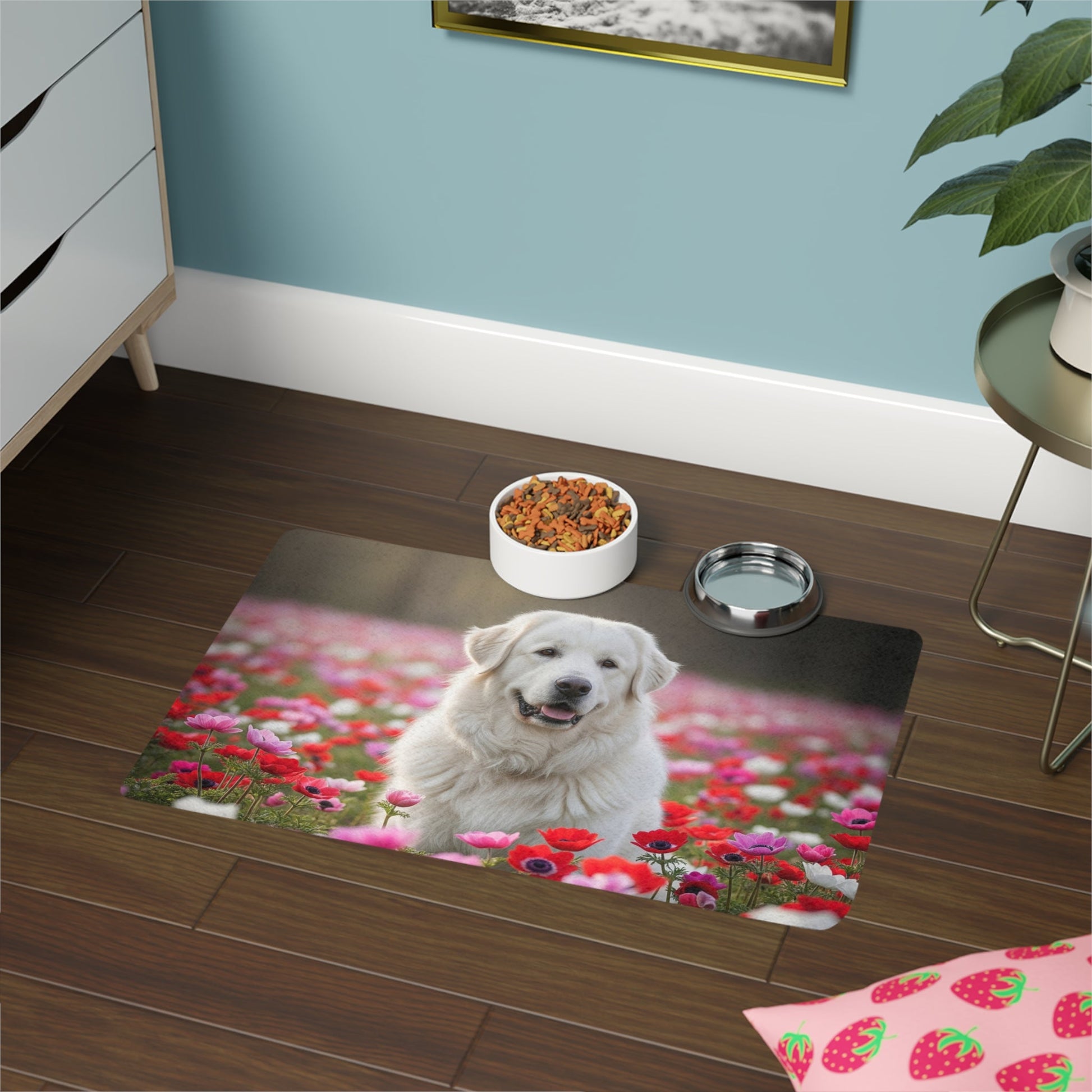 This Pet Food Mat 12x18 featuring a beautiful Maremma Sheepdog design is perfect for pet owners looking to add a touch of style to their pet's feeding area. The strong polyester front and neoprene rubber backing ensure durability and slip resistance. Vibrant colors make this mat stand out and add personality to your space. Perfect for pet owners celebrating their love for their furry friends.