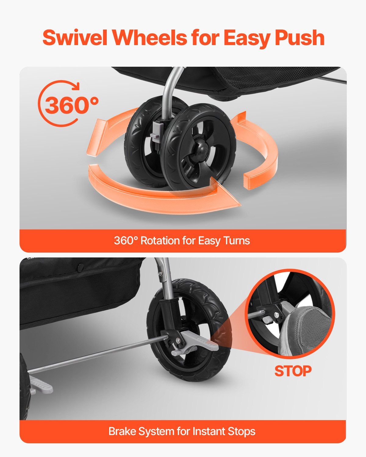 Smooth and Stable Mobility: Featuring 6-inch EVA foam wheels for shock absorption, this foldable pet stroller offers versatility across grass, sidewalks, and sand. A 360° rotating front wheel ensures easy navigation, while rear brakes provide security during stops.