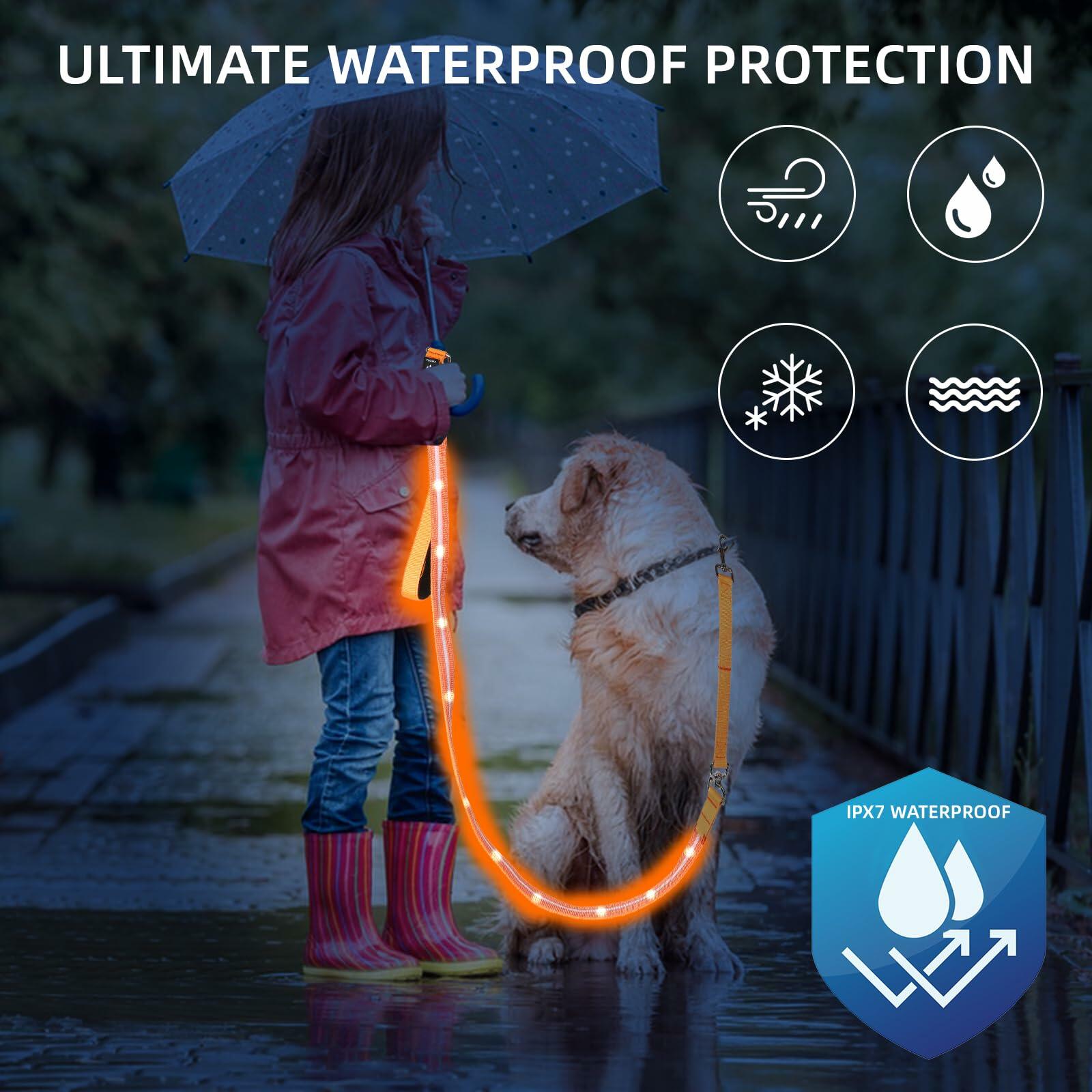 - WATERPROOF: Light up dog leash is 100% waterproof, which means you don't have to worry about it getting damaged if you and your dog are caught in the rain or walking near water sources. The waterproof design also ensures the leash is easy to clean
