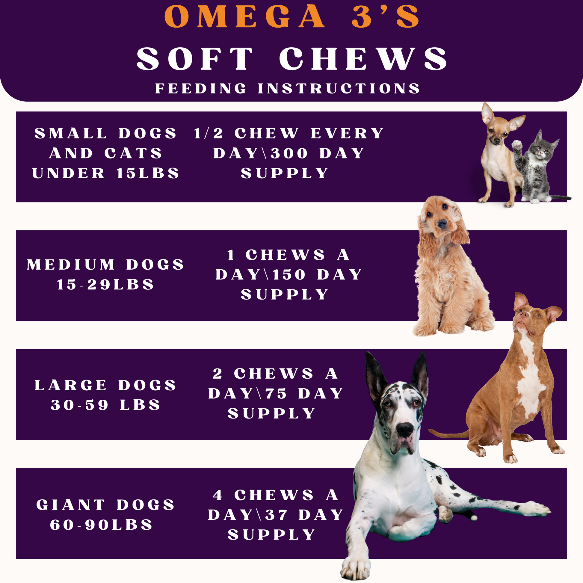 Omega-3 Fatty soft chews provide a highly concentrated source of Omega-3 Fatty Acids. Recommended to support a healthy immune system and maintain a healthy and normal inflammatory response.HEALTHY IMMUNE SYSTEM - Our pets deserve only the best. These chews are formulated with Omega fatty acids that are essential to everyday health and support your pet's immune system making them stronger and more active.