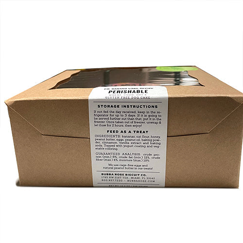 Cakes might just be what we do best around here, and we have lots of top selling options for you to choose from! These are soft, peanut butter banana cakes decorated with a hard yogurt coating. These are perishable, soft cakes (not stacked cookies). They can be personalized at no additional charge. A perfect treat for up to 4 medium sized dogs. A candle is included. They are best cut with a serrated knife. Storage instructions are right on the front of the box, as these are perishable cakes and do need to be stored in the freezer or refrigerator upon receipt.
