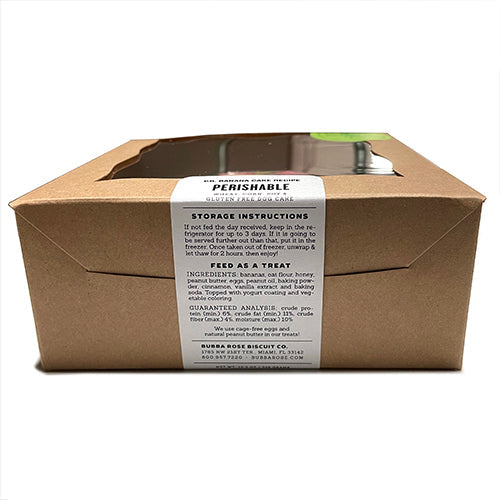 Cakes might just be what we do best around here, and we have lots of top selling options for you to choose from! These are soft, peanut butter banana cakes decorated with a hard yogurt coating. These are perishable, soft cakes (not stacked cookies). They can be personalized at no additional charge. A perfect treat for up to 4 medium sized dogs. A candle is included. They are best cut with a serrated knife. Storage instructions are right on the front of the box, as these are perishable cakes and do need to be stored in the freezer or refrigerator upon receipt.