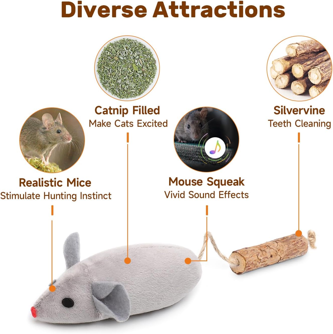 Pure Catnip & Silvervine: The Mice Toys are stuffed with 100% pure, potent and organic catnip inside. Also comes with silvervine tails. The aroma of catnip and silvervine will maximize the chance to make cats excited and make interactive playtime irresistible. Catnip and silvervine are all natural herbs, It’s helpful to release your fur babies’ boredom and soothe mind for her