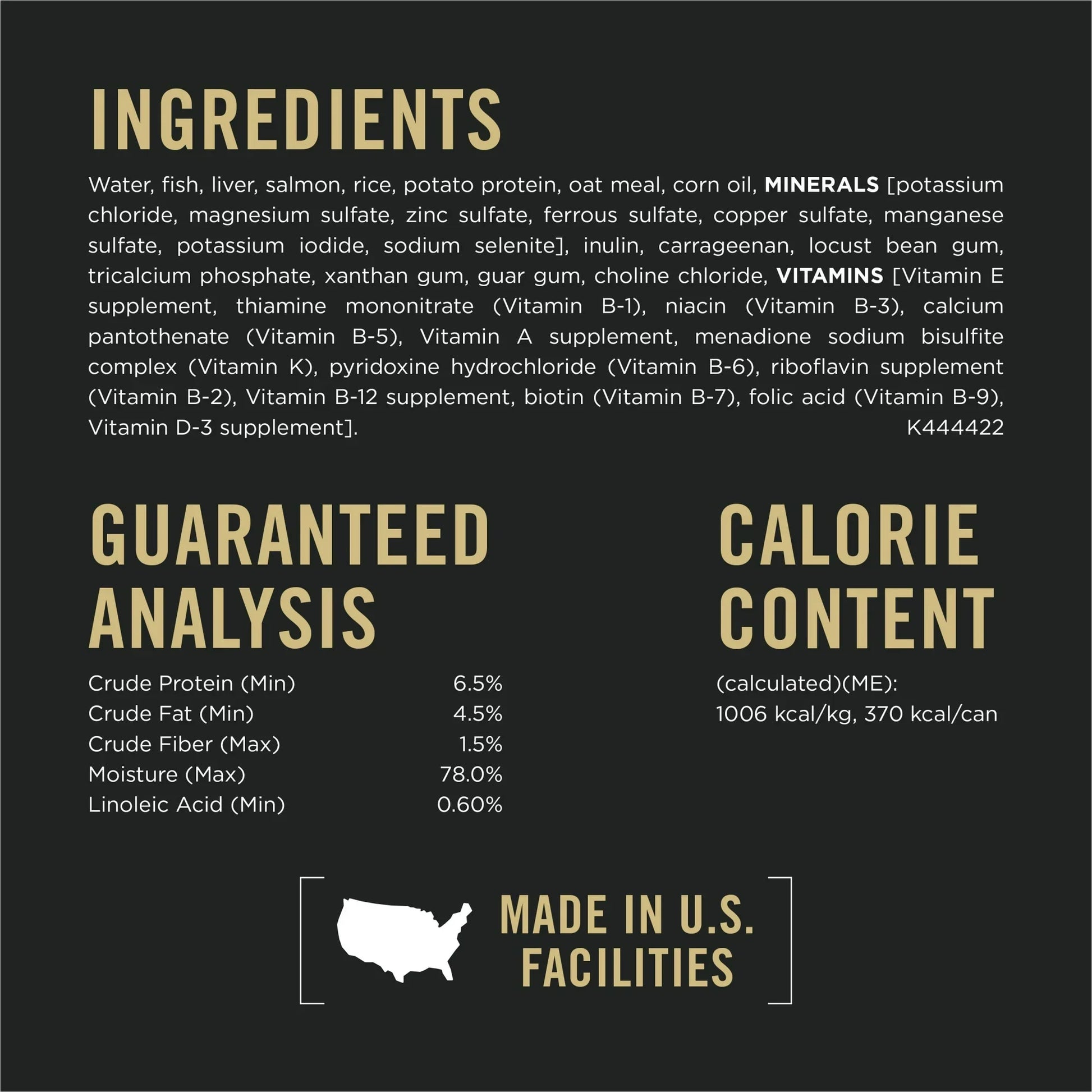 Focus on your dog's unique nutritional needs with Purina Pro Plan Specialized Sensitive Skin and Stomach Salmon and Rice Entree dog food. This nutrient-rich canned dog food with real salmon, along with easily digestible rice, is gentle on his digestive system. Every high-quality ingredient in this sensitive skin and stomach dog food is chosen for a specific nutritional or functional purpose. We include linoleic acid, an omega fatty acid, in the dog food for sensitive stomachs to help support his healthy skin and coat, and a high protein level helps maintain lean muscle. Plus, natural prebiotic fiber for dogs in this canned dog food nourishes specific intestinal bacteria for digestive health. Highly digestible, it supports optimal nutrient delivery and has no artificial colors, flavors or preservatives. This adult dog food provides 23 essential vitamins and minerals and is 100 percent complete and balanced.