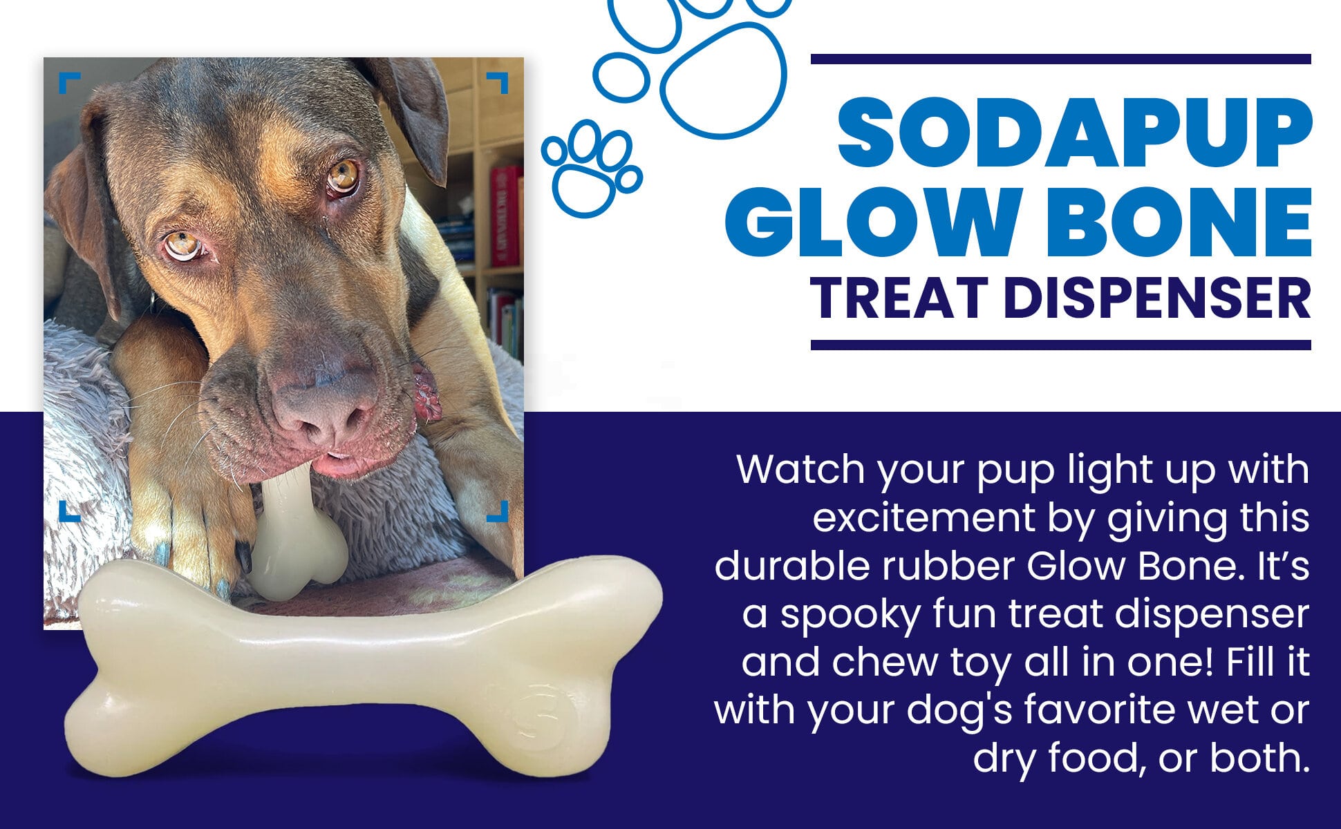 The SodaPup PUP-X Synthetic Rubber Bone is a versatile dog toy designed for chewing, fetching, and water play. Made from premium FDA-compliant PUP-X synthetic rubber in the USA, this bone-shaped toy combines the classic appeal of a traditional bone with moderate durability—it withstands moderate chewing but is not well suited to the most aggressive chewers. It also floats on water, and features a glow-in-the-dark option for extended playtime in any condition.