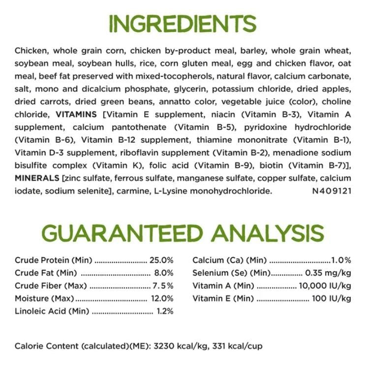 Premium farm-raised chicken dog food featuring farm-raised chicken is the number 1 ingredient Beneful dog kibble with added vitamins, minerals and nutrients has a naturally delicious taste with no artificial preservatives or flavors and added colors only from natural sources Calorie-smart wholesome Beneful dry dog food nutrition to help maintain a healthy weight Purina Beneful dog food with 25g of protein for dogs in every cup to help support strong, lean muscles Our 100 percent complete and balanced adult dog food kibble includes 23 essential vitamins and minerals