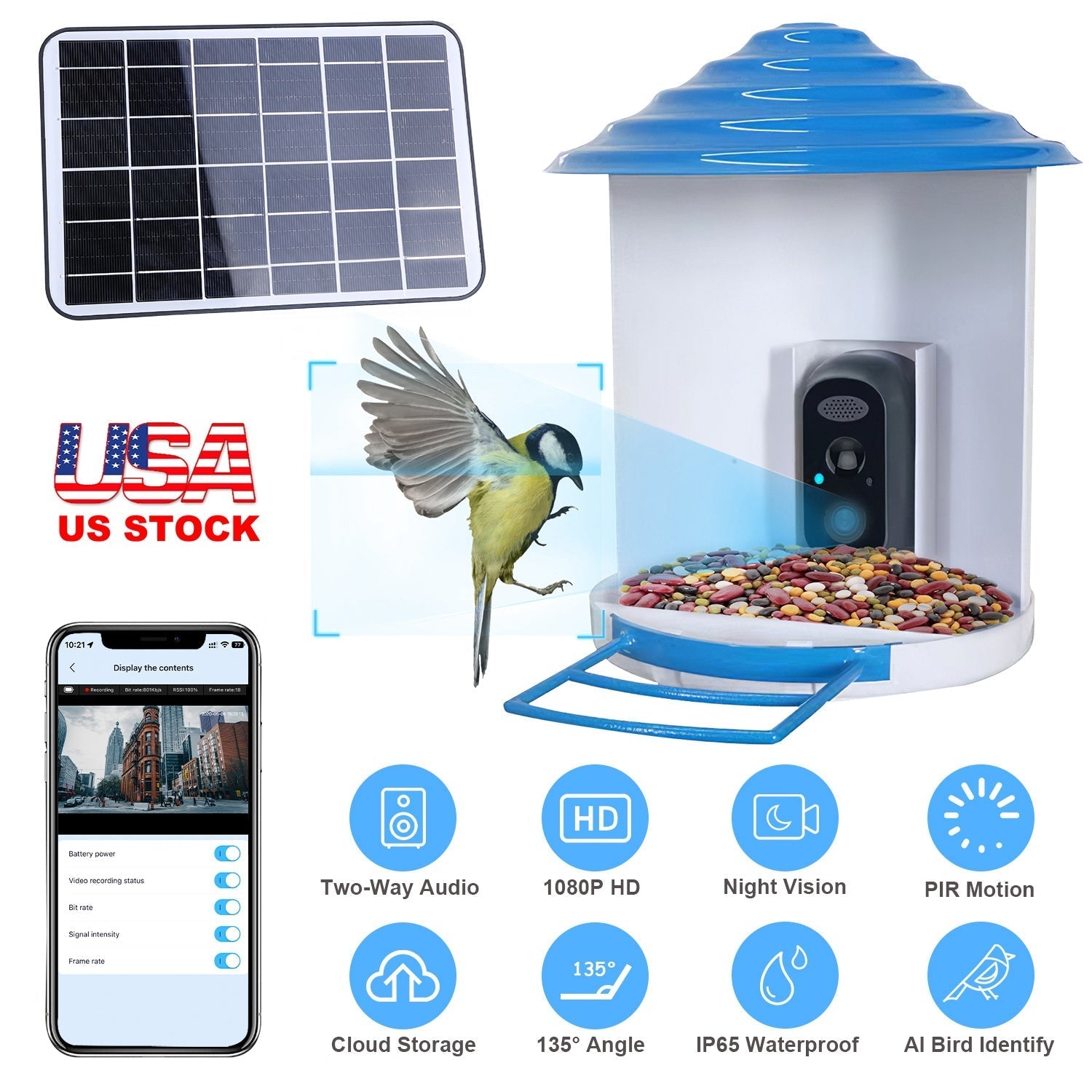 Smart Bird Feeder with Solar Powered Camera 1080P HD AI Identify PIR Motion Auto Capture Video Cloud Card Storage WiFi Connection App Control IP65 Wat