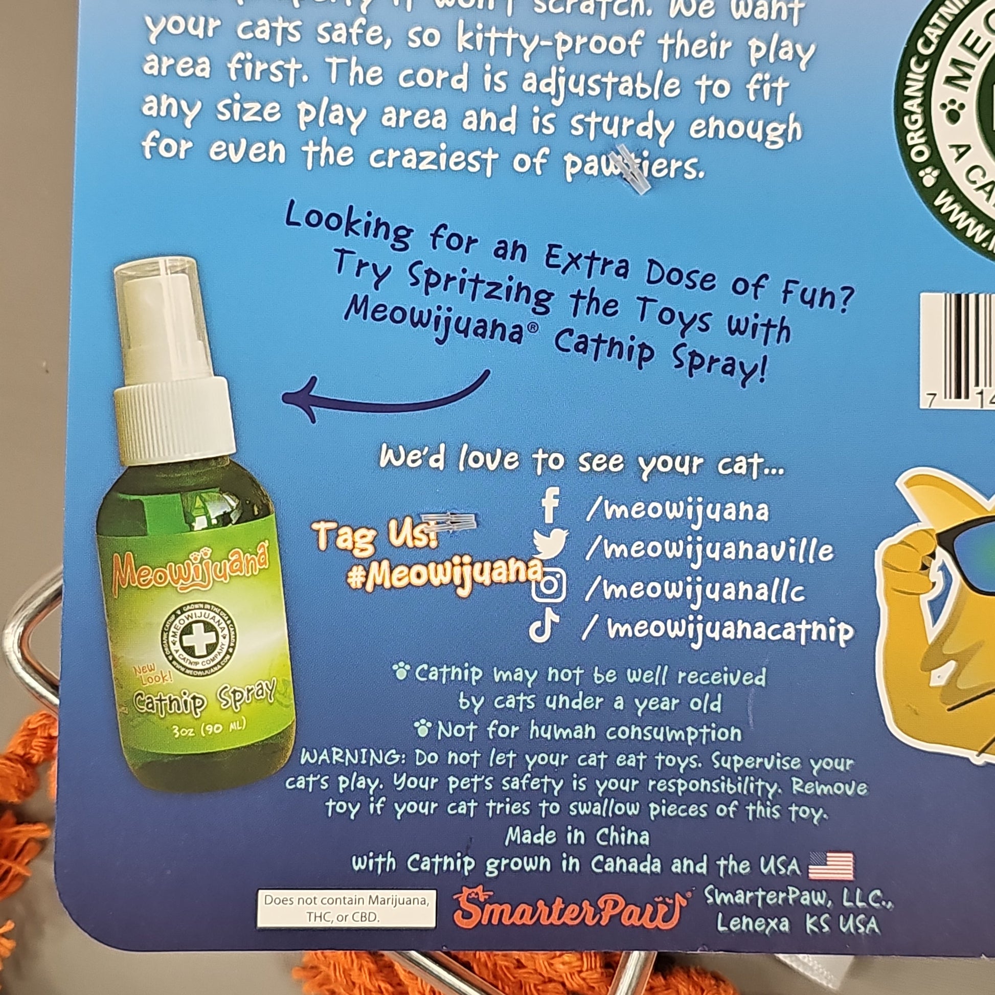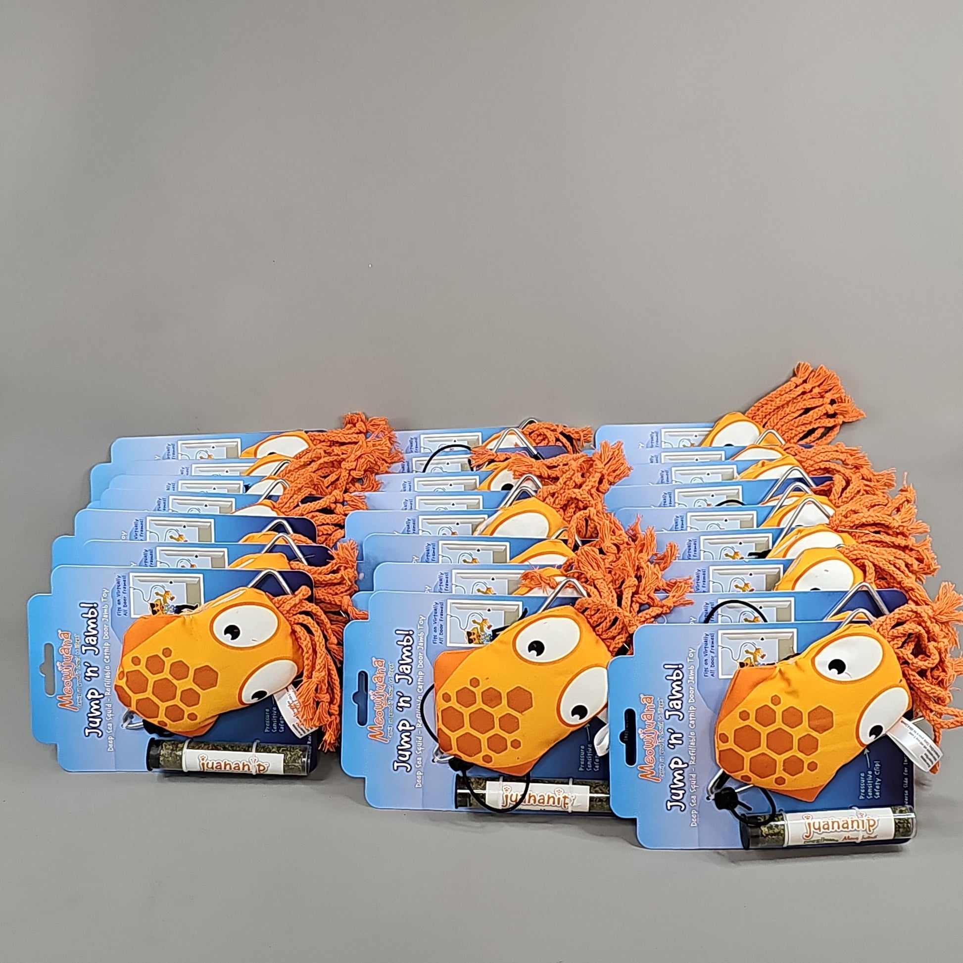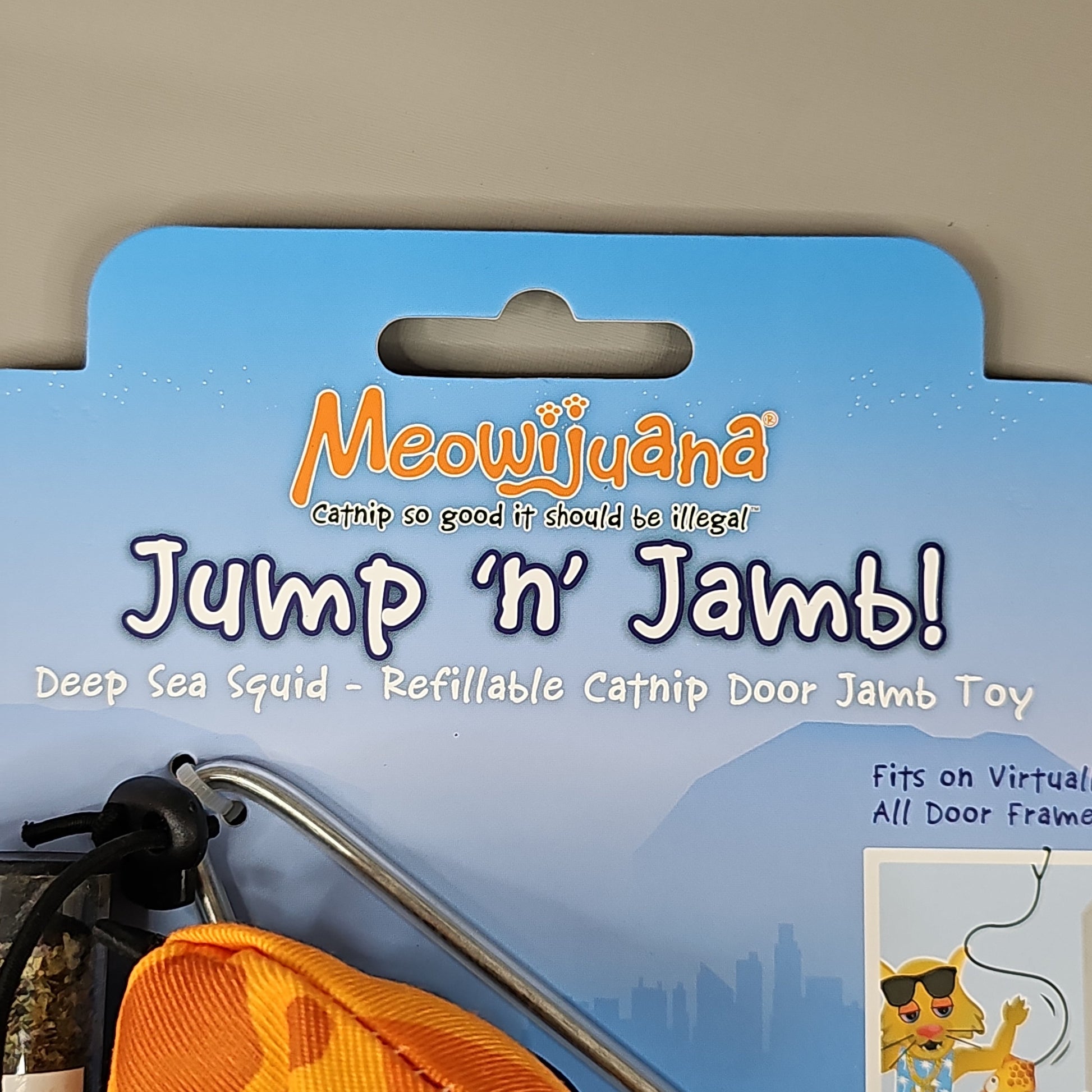 Get things jumpin' with the Meowijuana Jump 'n' Jamb Deep Sea Squid Refillable Swinging Door Jamb Cat Toy. This hanging door frame toy has a cool catnip pocket on the side, so you can tuck in all the stimulating herb your kitty wants. Just fill it up, clamp the sturdy coated hanger onto your door frame, and watch your cats dive in deep with this sassy sea squid. The elastic cord adjusts to fit any size door and a break-away clip helps keep your kitty safe. The cord is adjustable to fit any size play area and is sturdy enough for even the craziest of paw-tiers. Your cat will have oceans of fun with this toy!