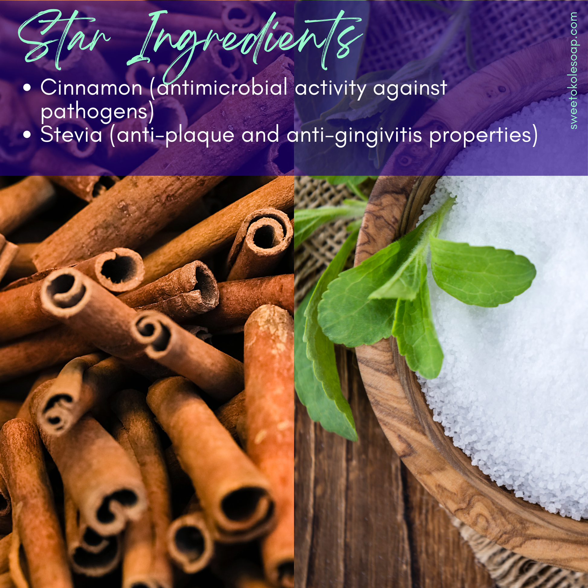 The herbs selected are all loved for their impacts on oral health like, keeping mouth tissues healthy and moist. The hydroxyapatite, clay and diatomaceous earth are mineral rich, which teeth love!