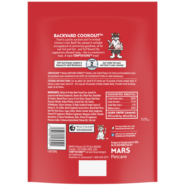 Reward your cat with scrumptious playtime cat snacks that are 100% nutritionally complete for adult cat maintenance and that help to control tartar. Featuring a tempting mix of cookout-inspired flavors, such as chicken, beef and liver, TEMPTATIONS MixUps variety cat treats are a great-tasting playtime reward. They're the perfect size treats for cat toys, so try placing a few inside a treat dispenser toy and watch your cat chase and swat away. Plus, at only 2 low calories per treat, your feline friend can enjoy the crunchy outside and soft center anytime. America's #1 cat treat* is the perfect way to show your feline friend how much you care. (* Based on 2020 Nielsen sales data)