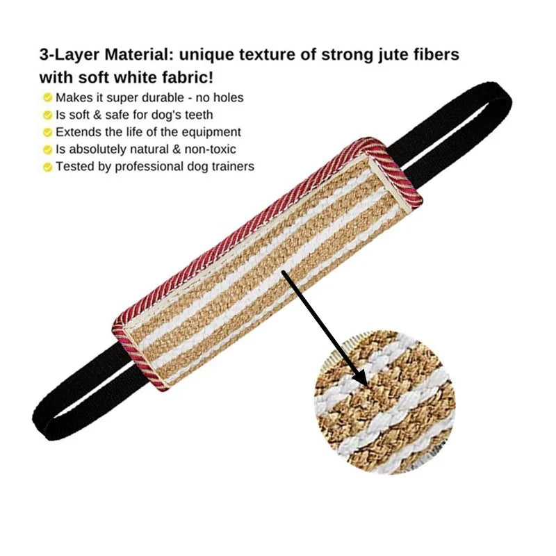 Build strength, bond, and train with this professional-grade tug toy! Perfect for puppies and dogs who love interactive play, this durable jute bite toy features dual handles for maximum control and engagement, making it the ideal training tool for building confidence and establishing healthy play behaviors.