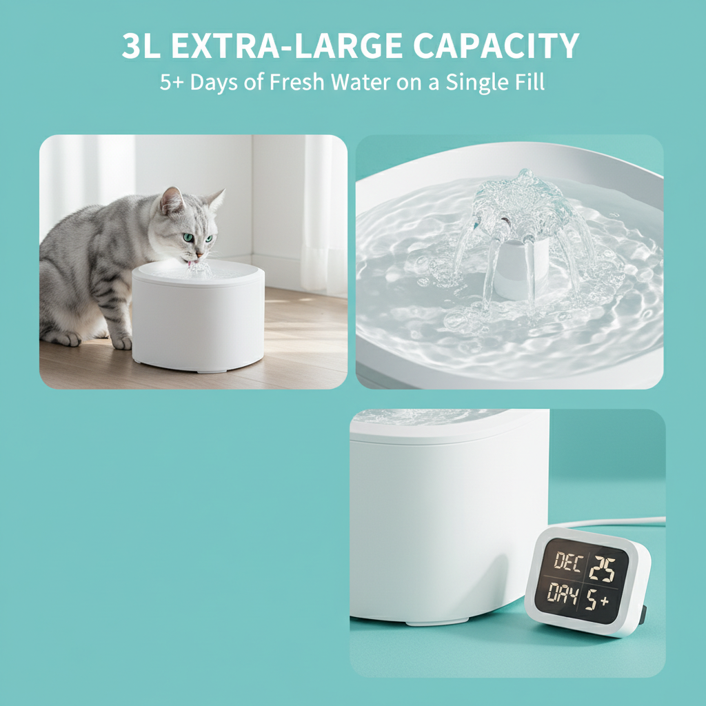 The standout feature of this smart fountain is its advanced motion sensor technology, which activates the water flow only when your pet is nearby. This intelligent function not only conserves energy but also keeps the water moving to prevent stagnation and maintain peak freshness. Combined with an ultra-quiet pump system, this fountain operates at a whisper-level decibel, making it an ideal choice for easily startled pets or owners who value a peaceful home environment.