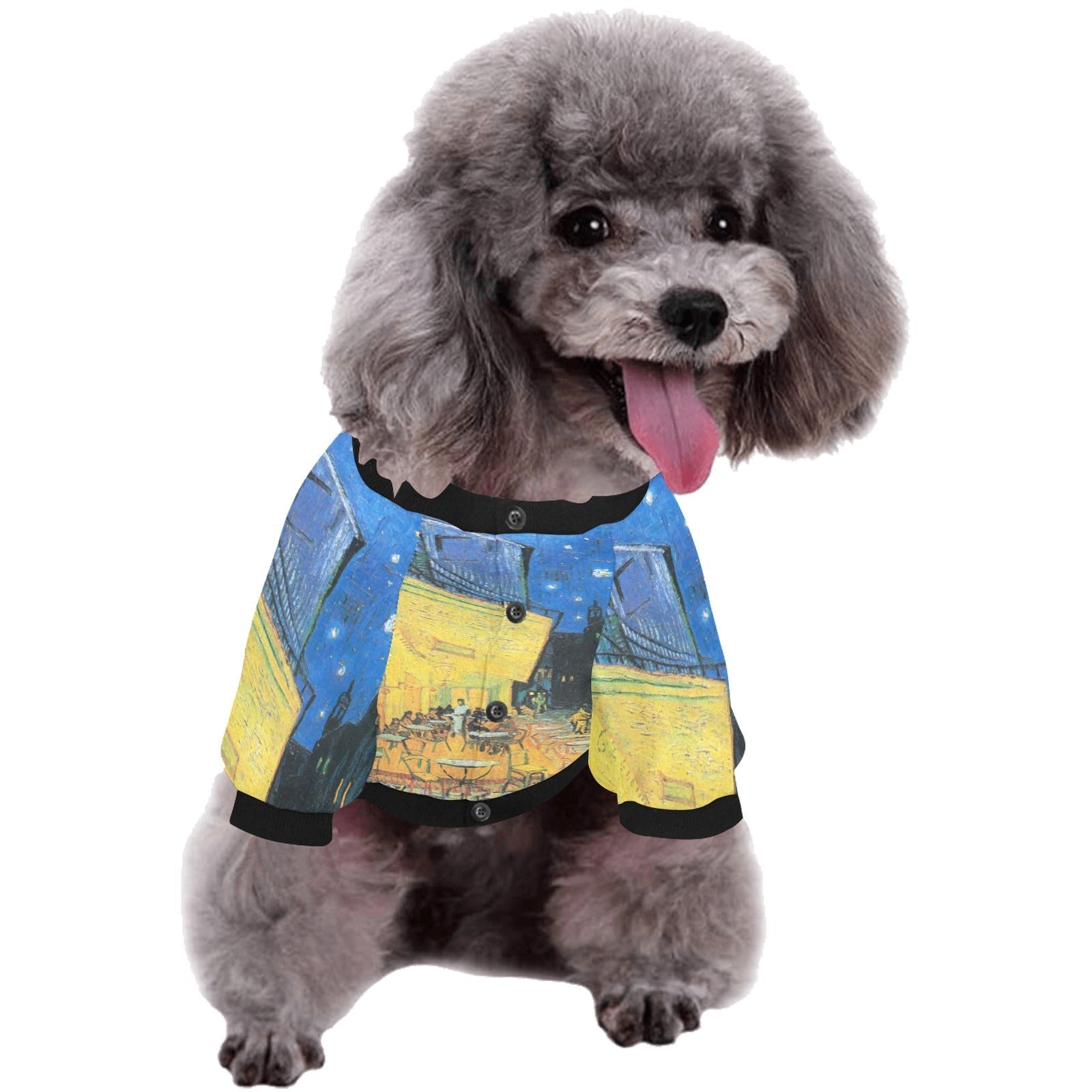 Make your furry friend look fab for their next coffee shop adventure with our Van Gogh Cafe Terrace At Night Round Neck Shirt! Crafted from 100% polyester, this shirt boasts a bold print of the iconic Cafe Terrace At Night painting by Vincent van Gogh. Its sturdy design and cozy fit make it ideal for any stylish pooch. And don't fret about spills - it's a breeze to clean!